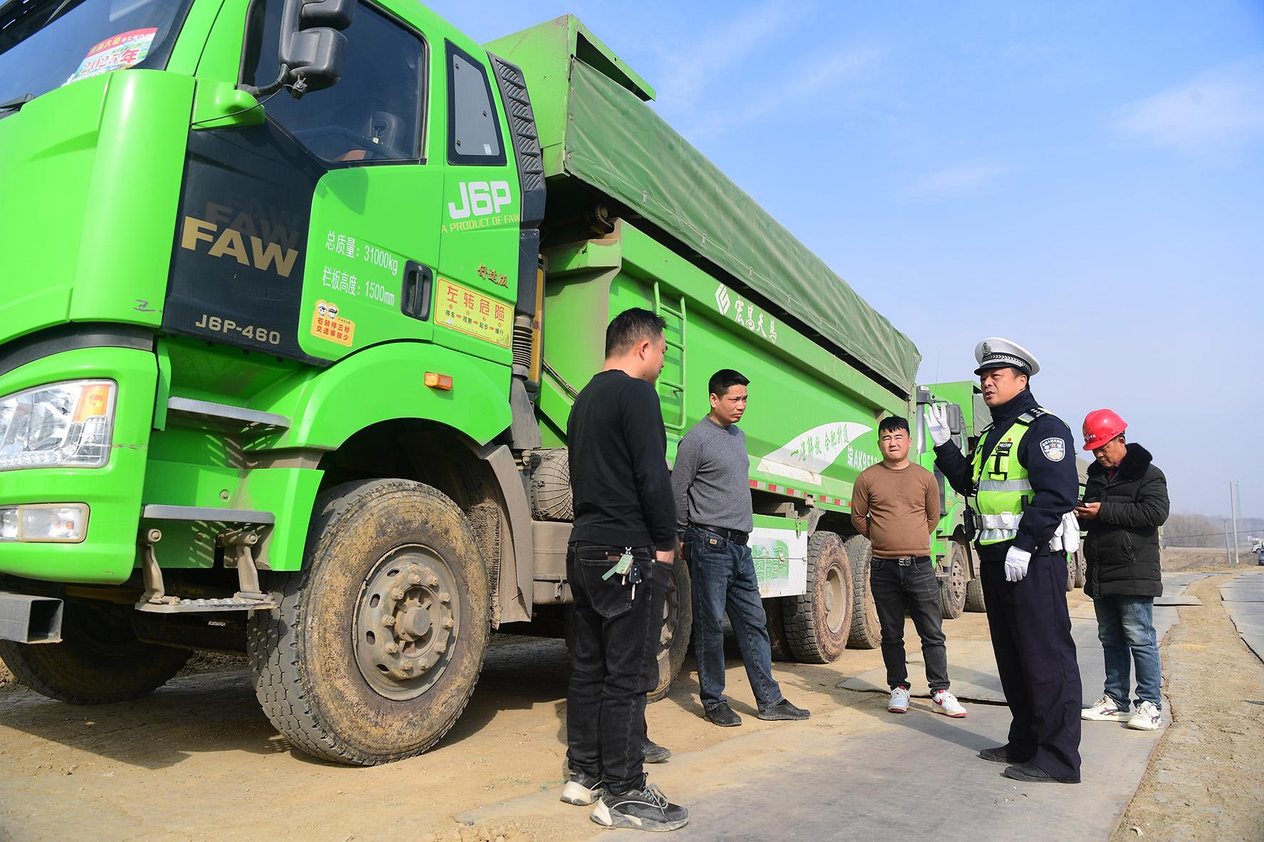 1月14日,安徽省巢湖市公安局交警大隊民警在運送石料場地開展對大貨車駕駛員的交通安全宣傳。