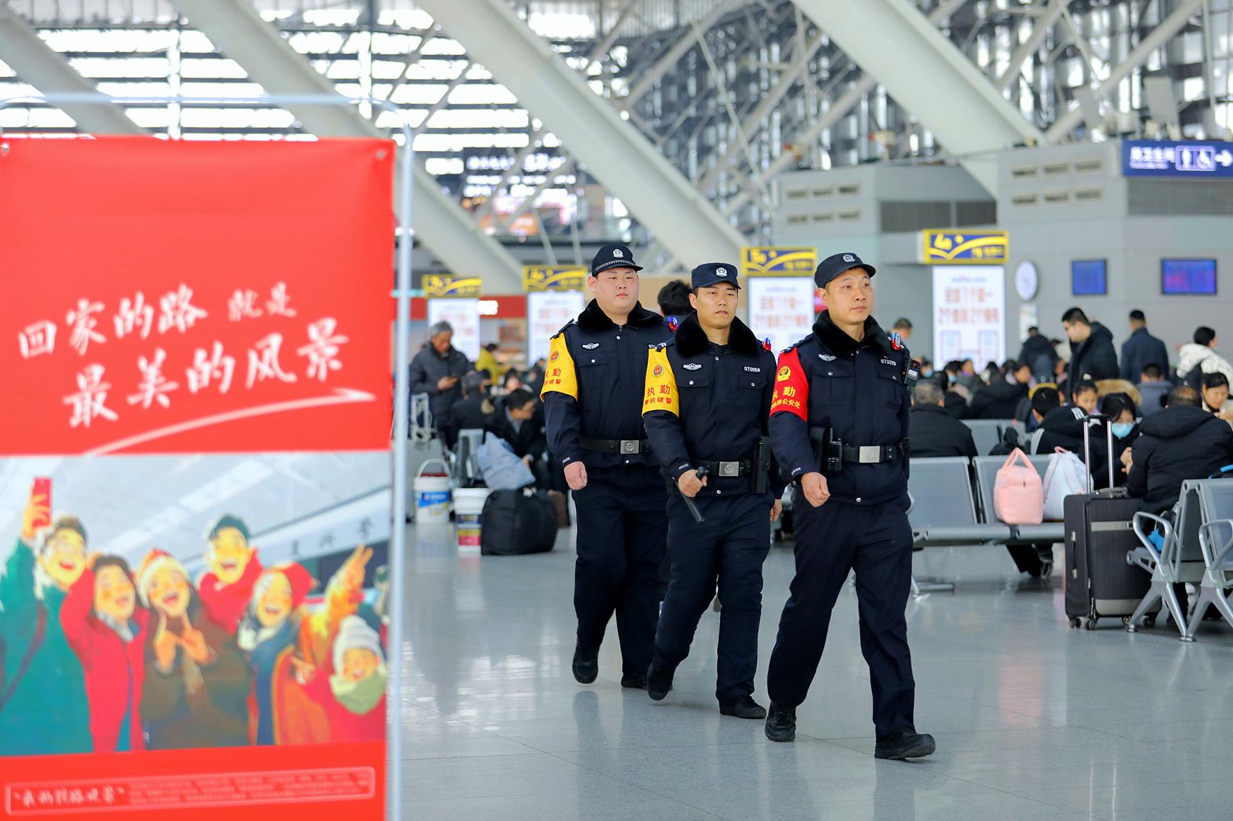 1月14日,在山東省青島火車北站,青島北站派出所民輔警在候車室執(zhí)勤巡邏、發(fā)放宣傳頁,守護旅客出行安全。