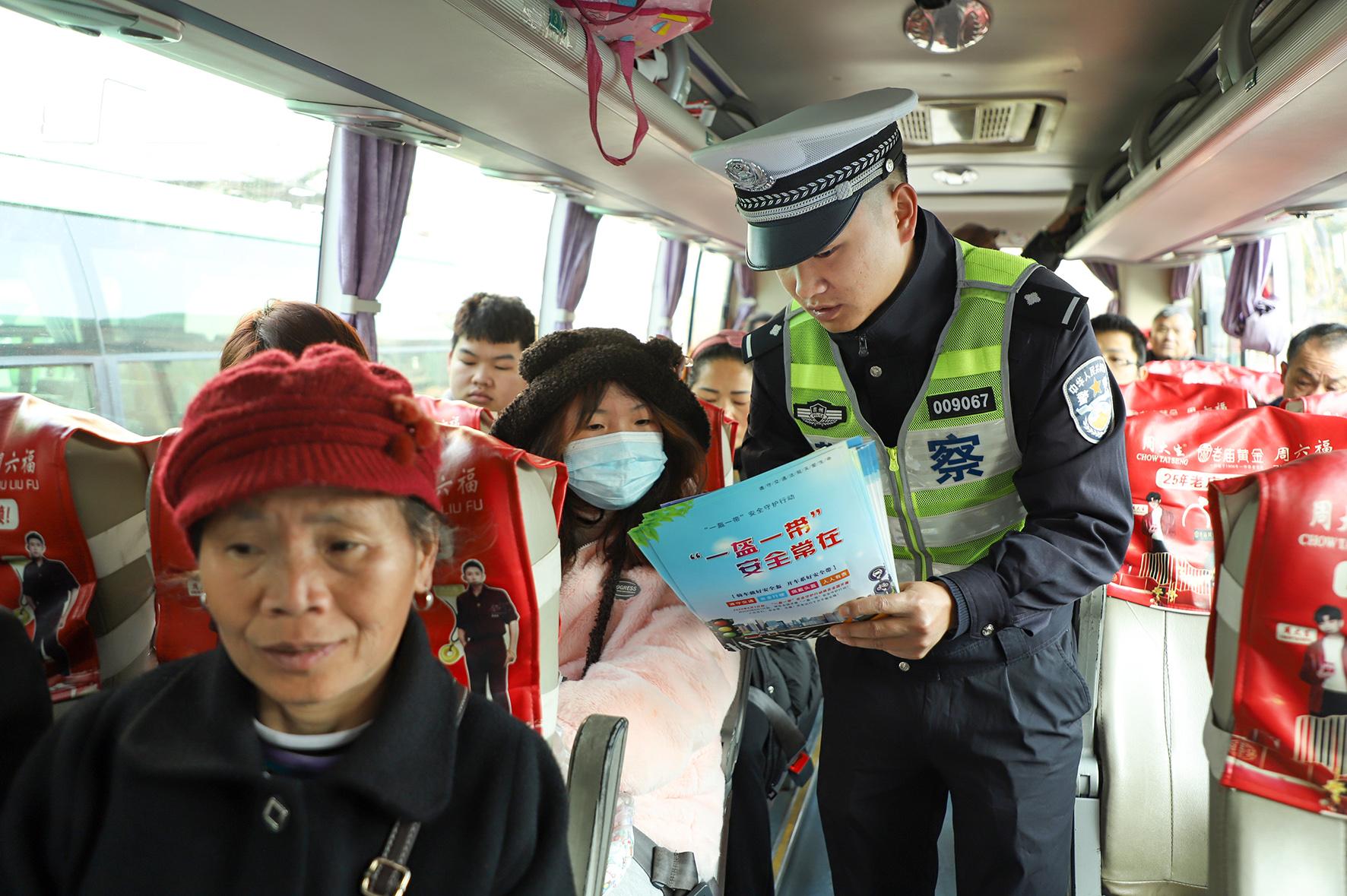 1月14日,浙江省岱山縣公安局交警大隊民警輔警來到汽車站、客運碼頭,向駕駛員、旅客發(fā)放春運宣傳資料,講解道路交通安全知識。