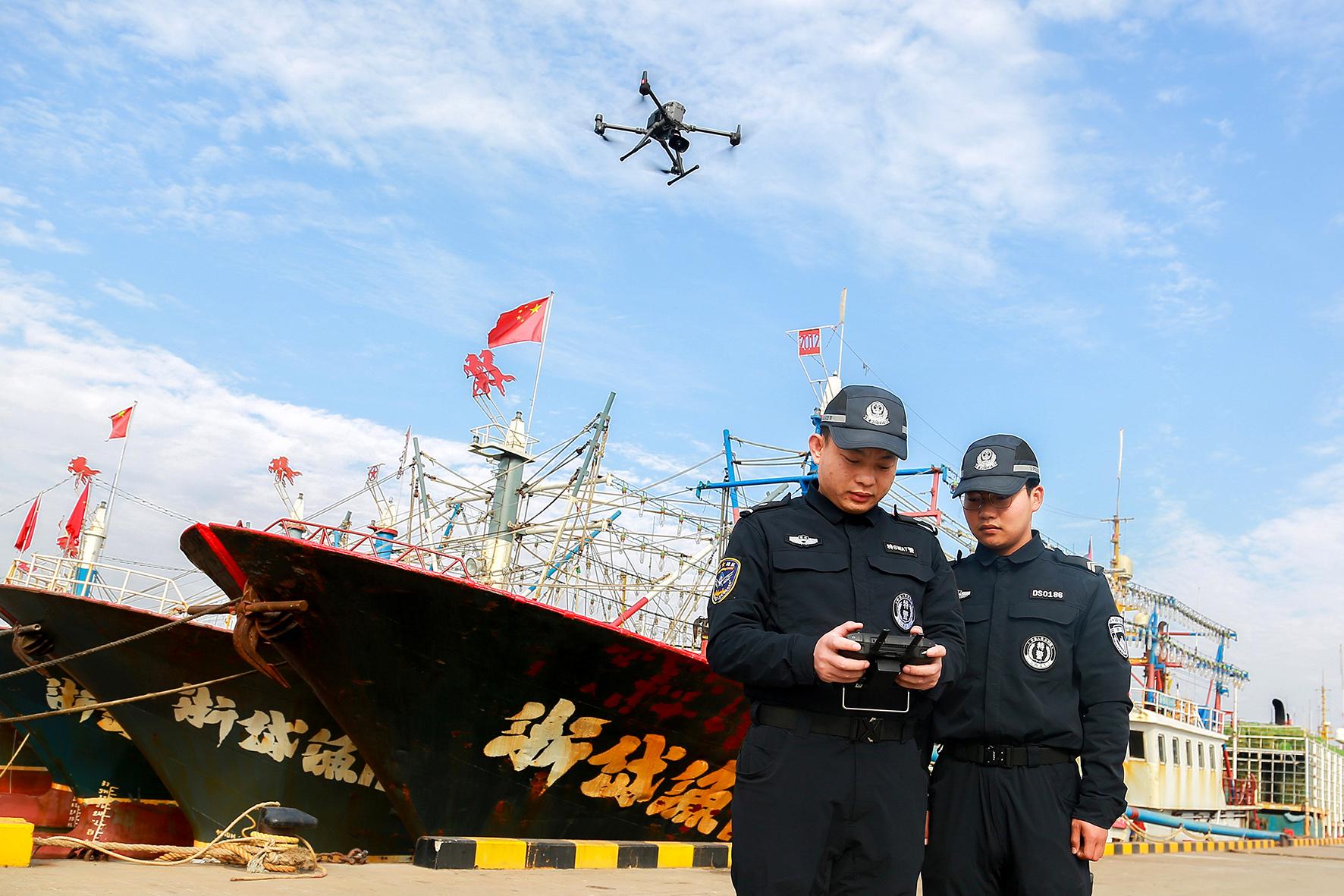 1月15日,浙江省岱山縣公安局巡特警大隊“魚鷹”戰(zhàn)隊民警輔警,結(jié)合“冬季行動”,利用警用無人機(jī)對轄區(qū)漁港碼頭進(jìn)行空中巡查,加強轄區(qū)海上治安防控工作力度,守護(hù)漁船民安全生產(chǎn)。