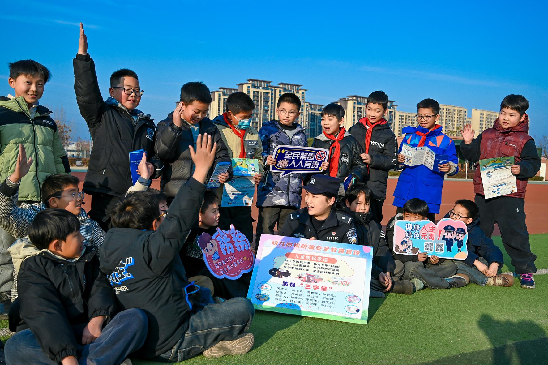 1月14日,在安徽省馬鞍山市和縣實驗小學(xué),轄區(qū)歷陽派出所民警在給學(xué)生講解防拐、防騙、交通安全等知識。寒假來臨,該縣公安機(jī)關(guān)及時開展“假前最后一課”宣傳活動。