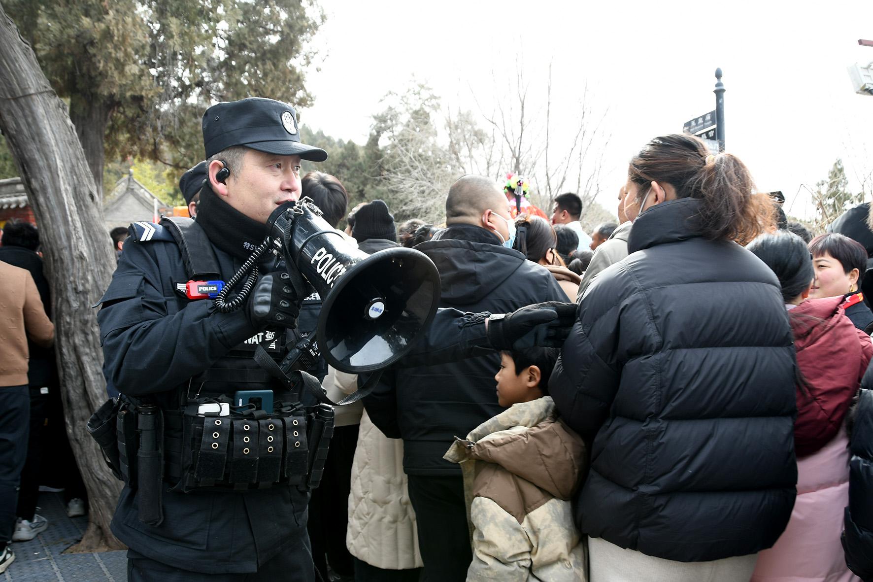 2月6日,河南省??h公安局民警輔警在正月古廟會現(xiàn)場執(zhí)勤。