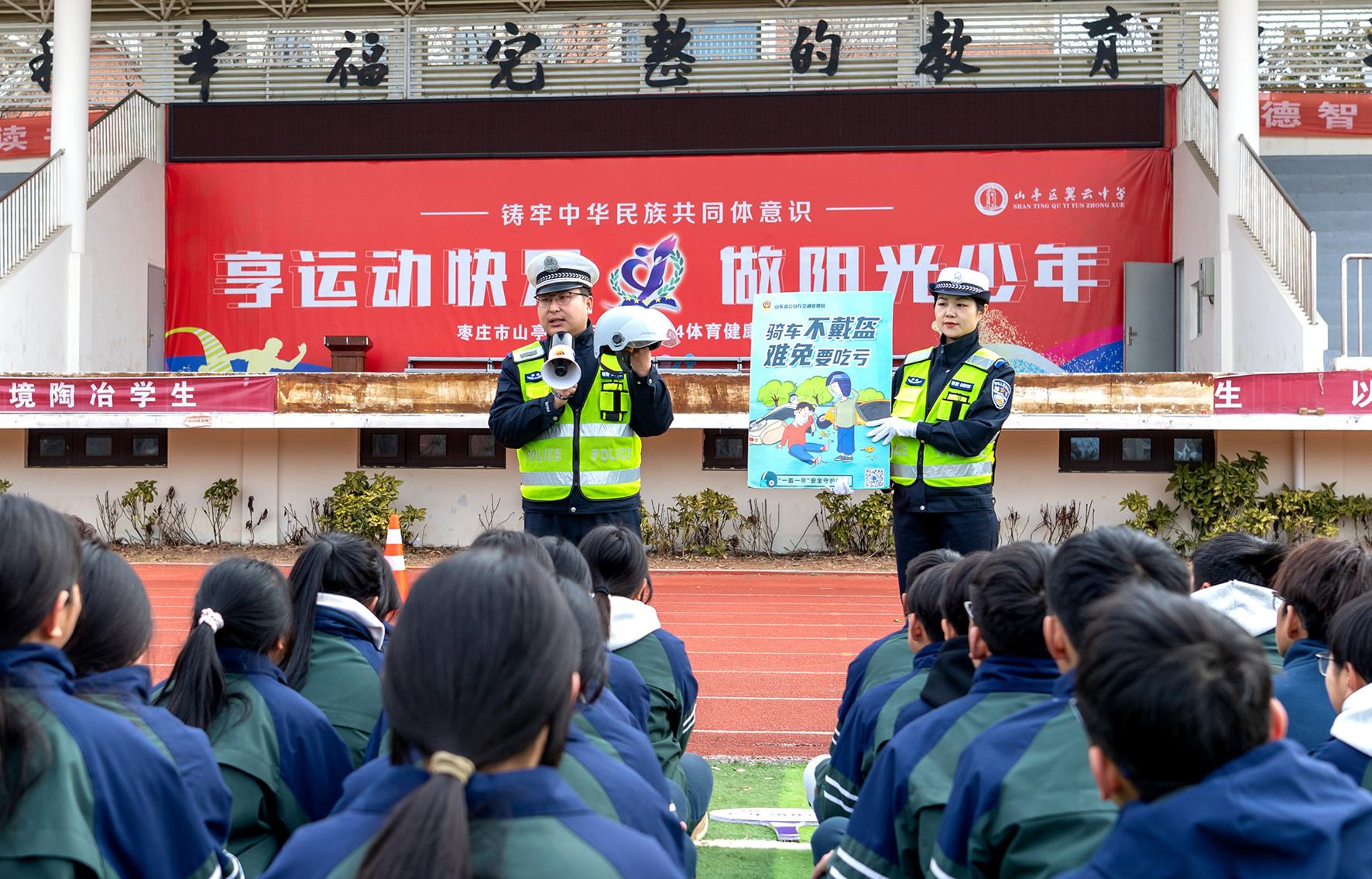 2月14日,山東省棗莊市公安局山亭分局交警大隊(duì)組織民輔警走進(jìn)轄區(qū)翼云中學(xué),開展春季“開學(xué)第一課”交通安全宣傳活動(dòng)。