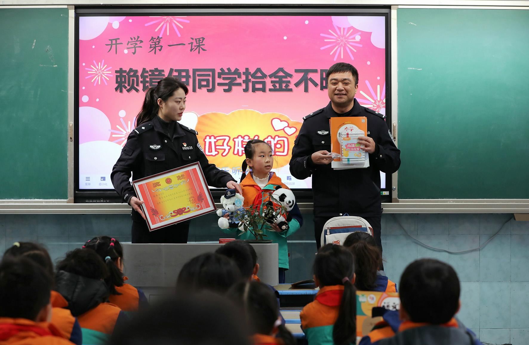 2月14日,安徽省寧國市公安局西津派出所借助開學(xué)“第一課”開展“送獎(jiǎng)進(jìn)課堂”思政教育。民警在表揚(yáng)拾金不昧學(xué)生的同時(shí),教育引導(dǎo)同學(xué)們要傳承弘揚(yáng)中華民族傳統(tǒng)美德,爭做新時(shí)代好少年。
