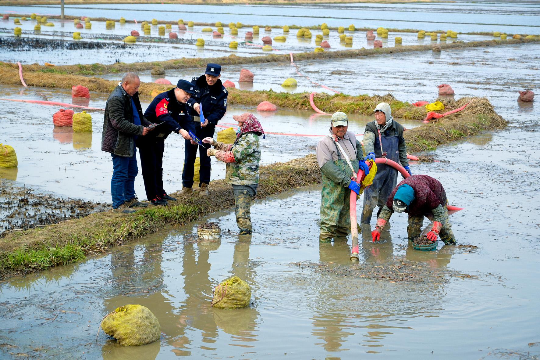 2月19日,安徽省馬鞍山市和縣公安局民警在西埠鎮(zhèn)棗林村走訪,向采收荸薺的群眾開(kāi)展法治宣傳。