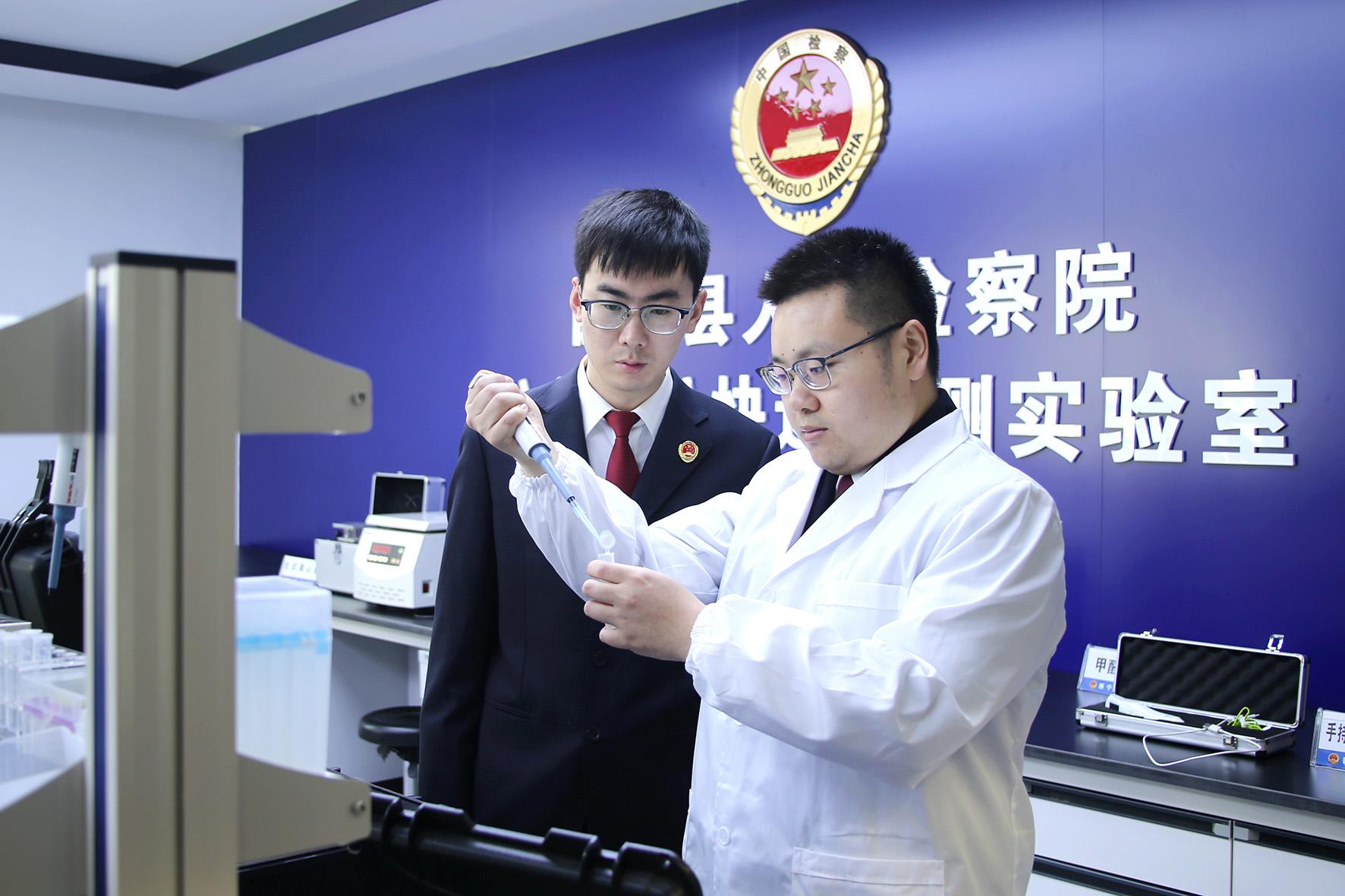 圖為辦案干警在公益訴訟快檢室對提取的污染物進(jìn)行檢測。