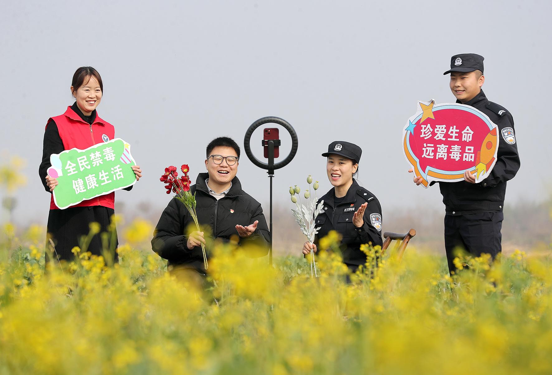 2月26日,在湖北省京山市羅店鎮(zhèn)馬嶺村,京山市公安局民警和禁毒志愿者在田間地頭,通過網(wǎng)絡(luò)現(xiàn)場直播的方式向群眾開展防范和打擊非法種植毒品原植物的普法宣傳。