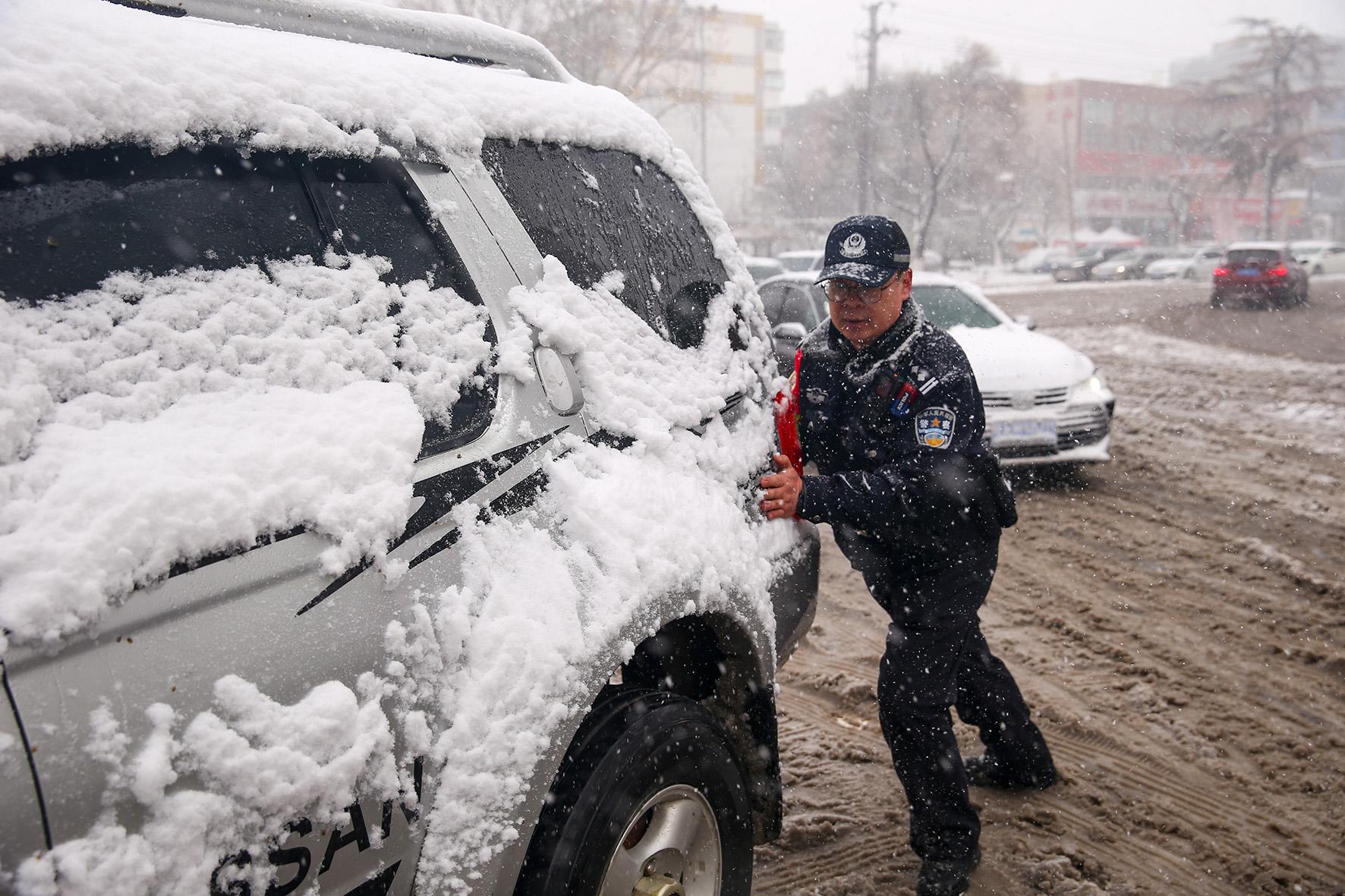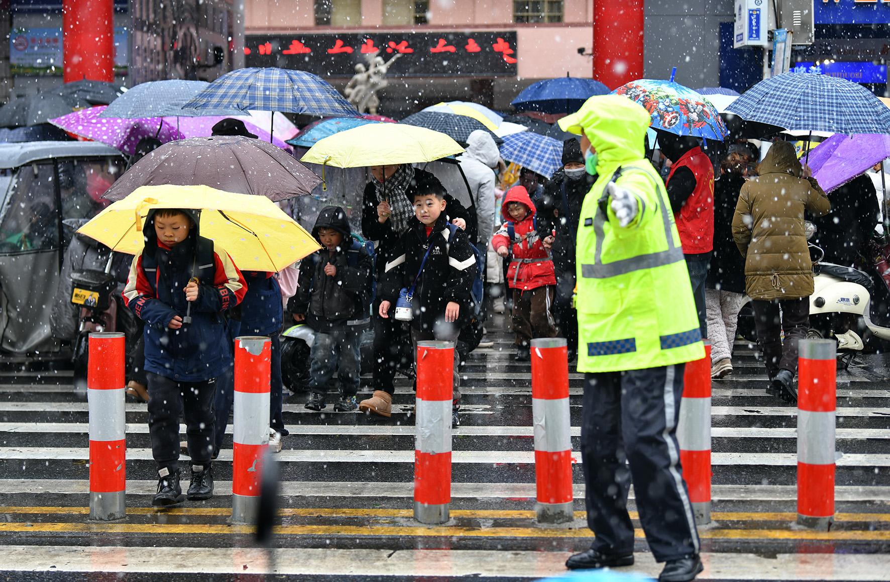 3月3日,安徽省阜南縣公安局交管大隊民警冒著風雪在城區(qū)一小學門口維持交通秩序。