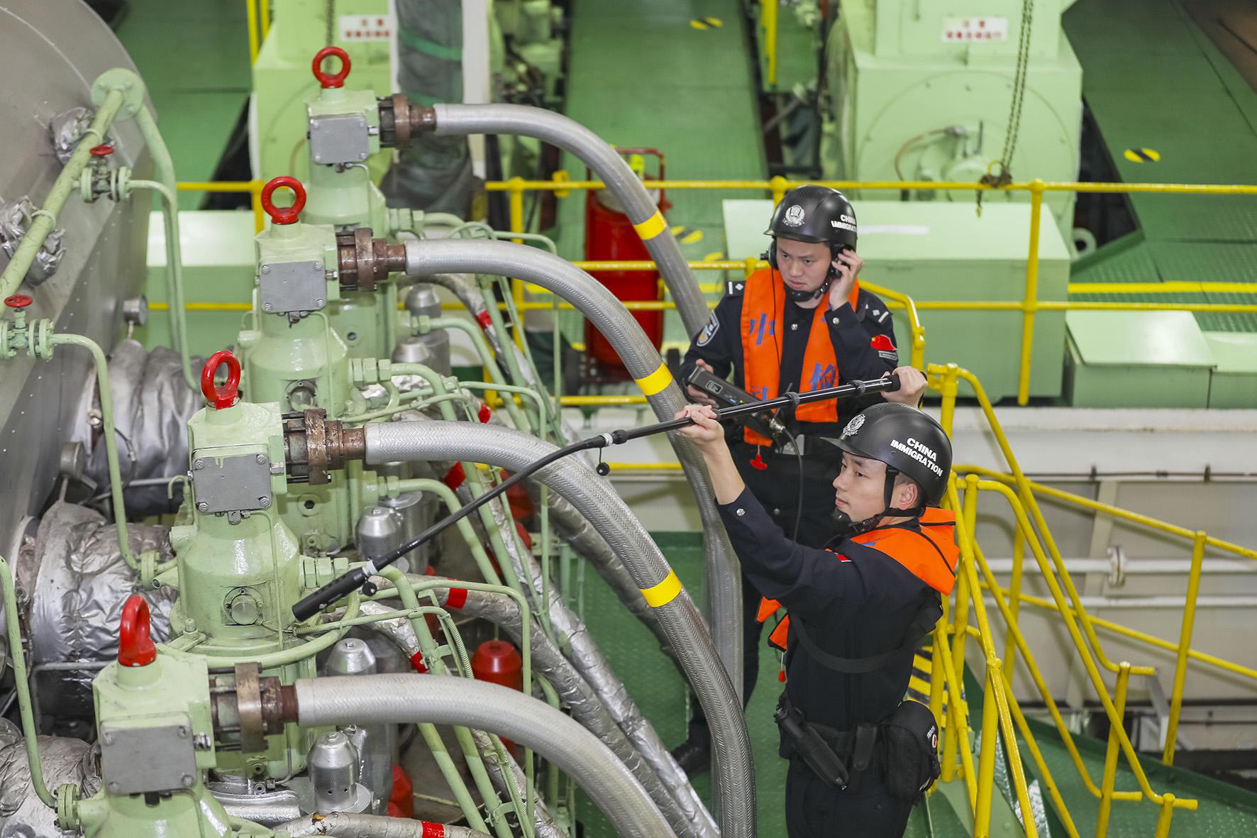 圖為3月1日,移民管理警察在貨輪機(jī)艙內(nèi)運(yùn)用紅外伸縮檢測儀進(jìn)行查驗。