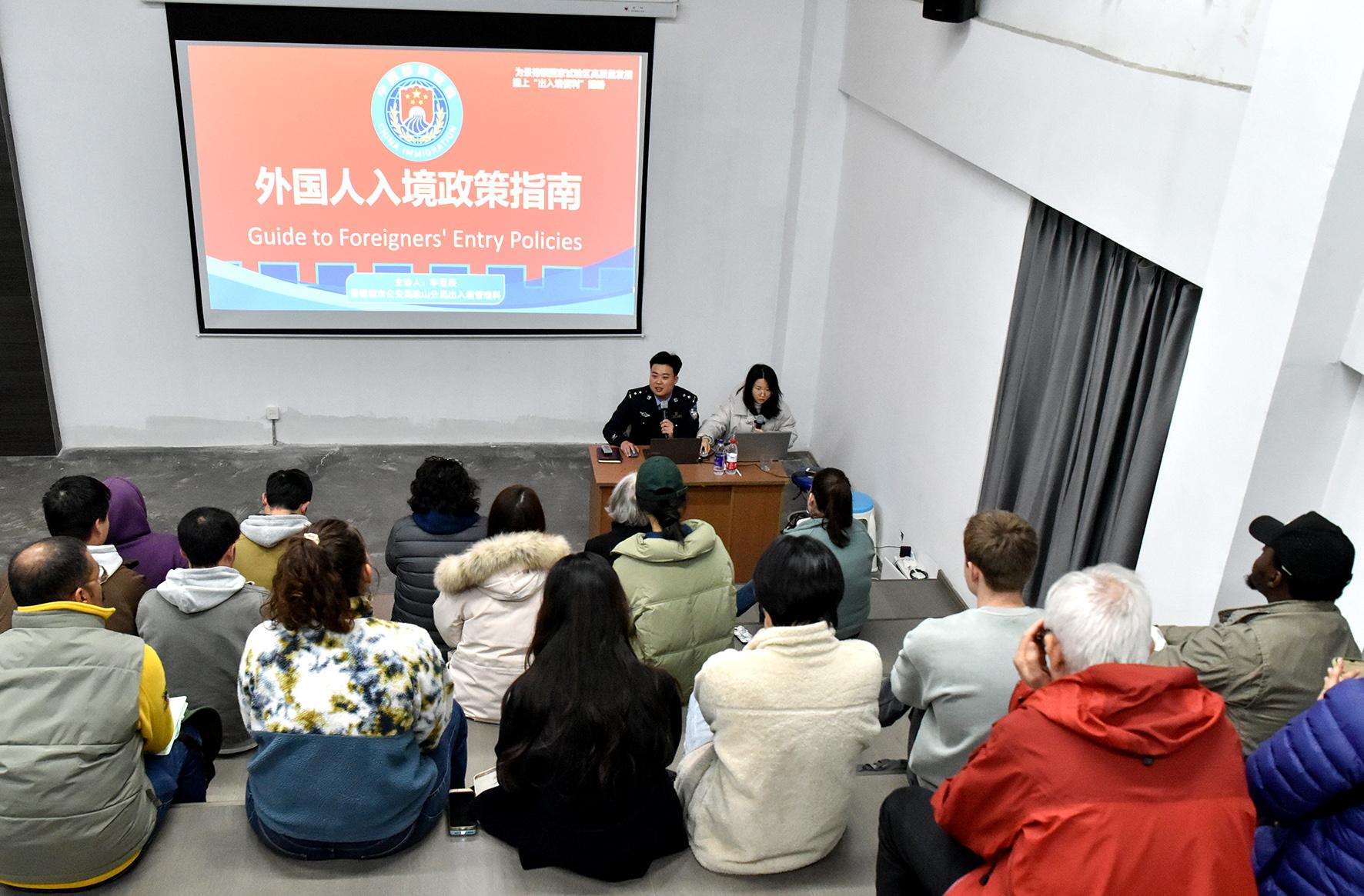 3月10日,在江西省景德鎮(zhèn)陶溪川國際陶藝工作室,景德鎮(zhèn)市公安局珠山分局出入境民警正在向外籍人士宣講240小時(shí)過境免簽政策。