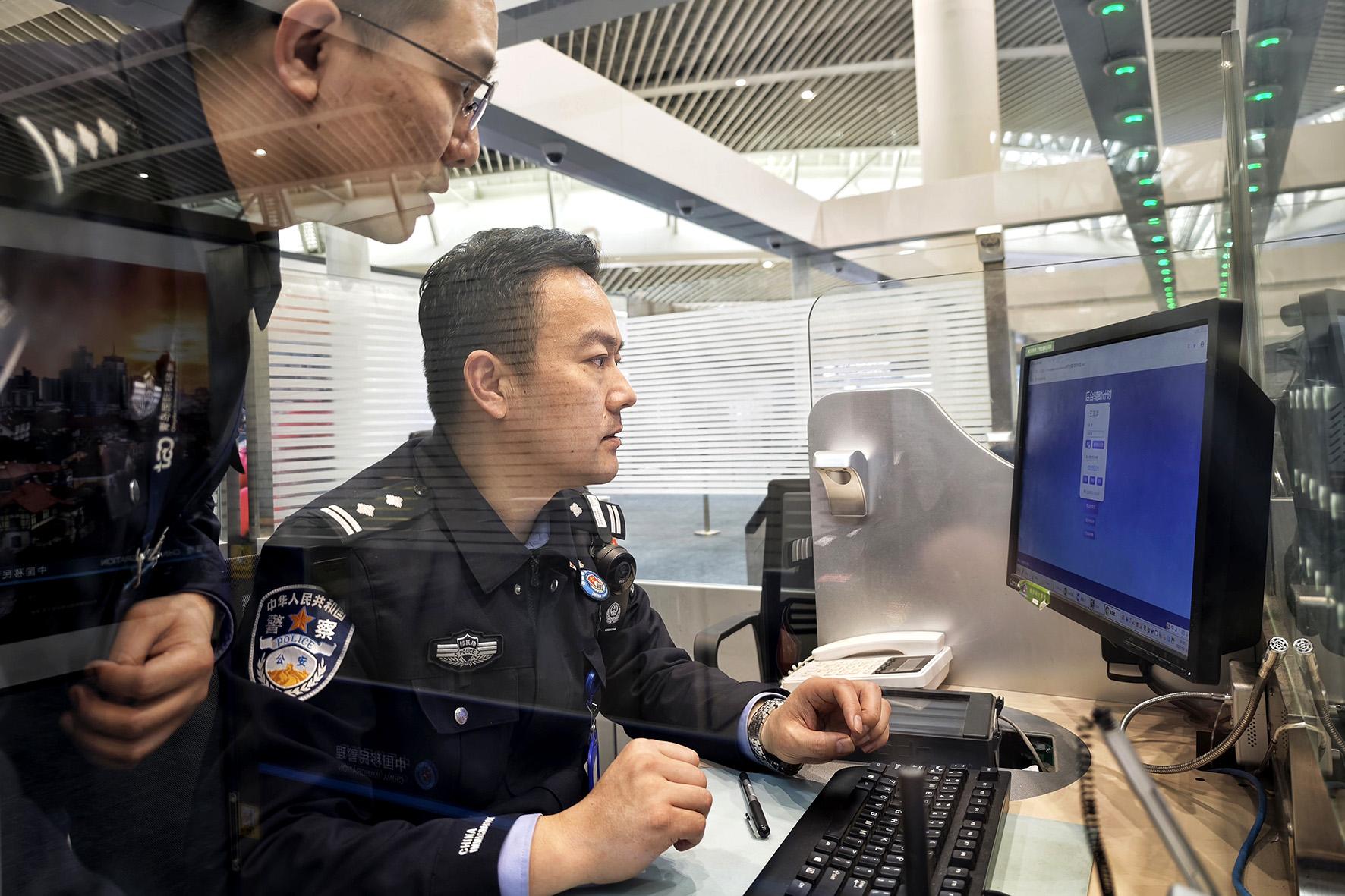圖為3月12日,青島機場邊檢站信息科技民警為基層一線執(zhí)勤人員講解“排班易”使用方法。