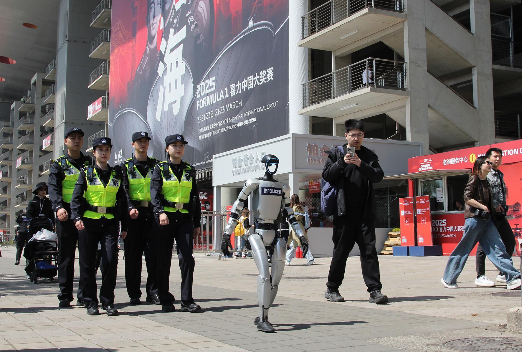 圖為民警與智能機(jī)器人在上海國際賽車場開展融合巡防。