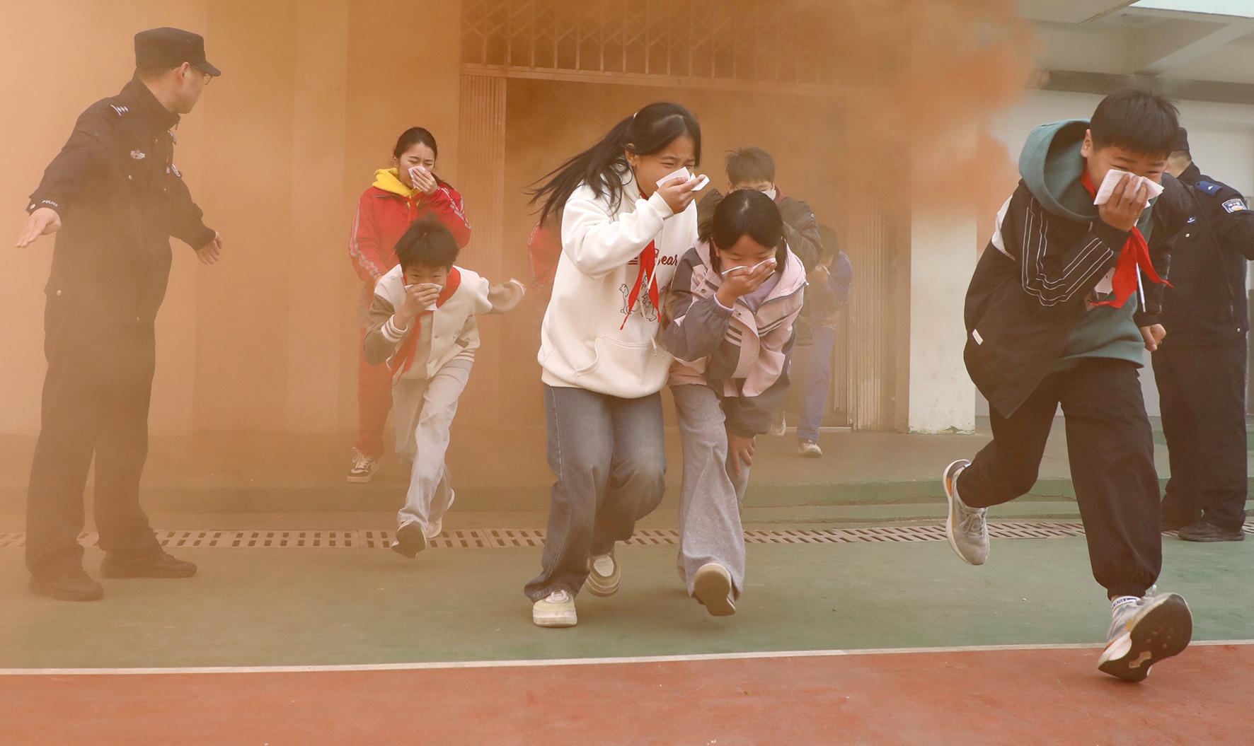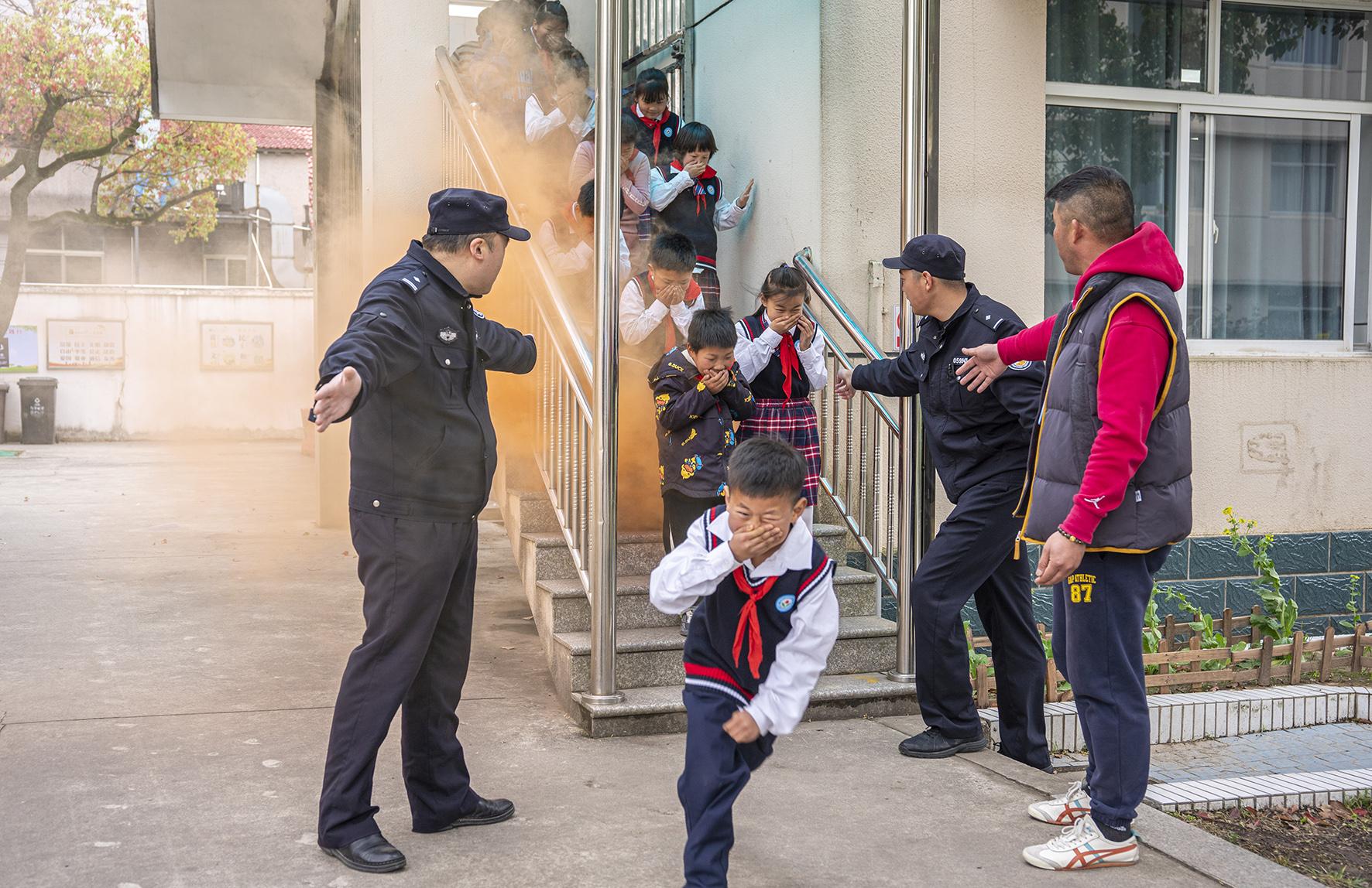 3月28日,江西省九江市公安局潯陽分局民警組織轄區(qū)學(xué)校學(xué)生們進(jìn)行消防逃生疏散演練。