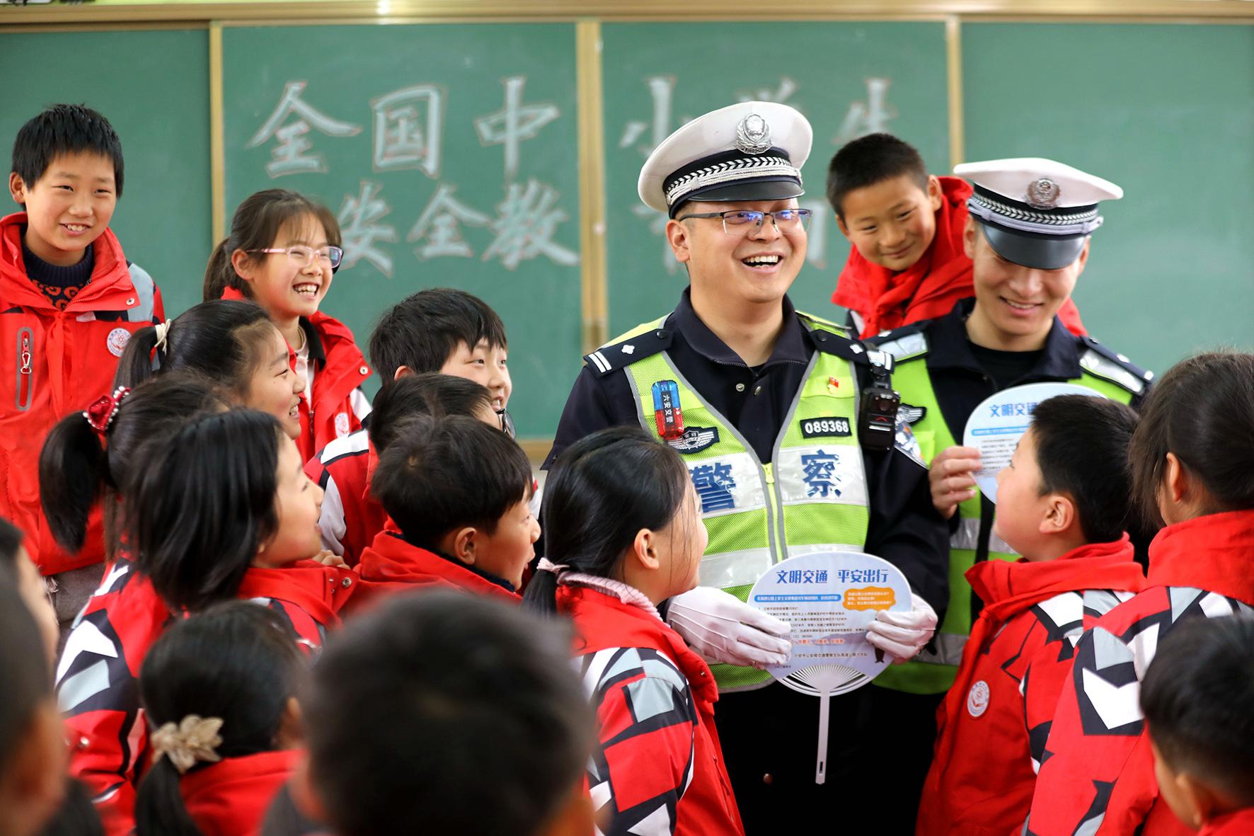 3月27日,安徽省阜南縣公安局交管大隊(duì)組織民警輔警走進(jìn)轄區(qū)中小學(xué)校開展交通安全知識(shí)宣傳活動(dòng)。