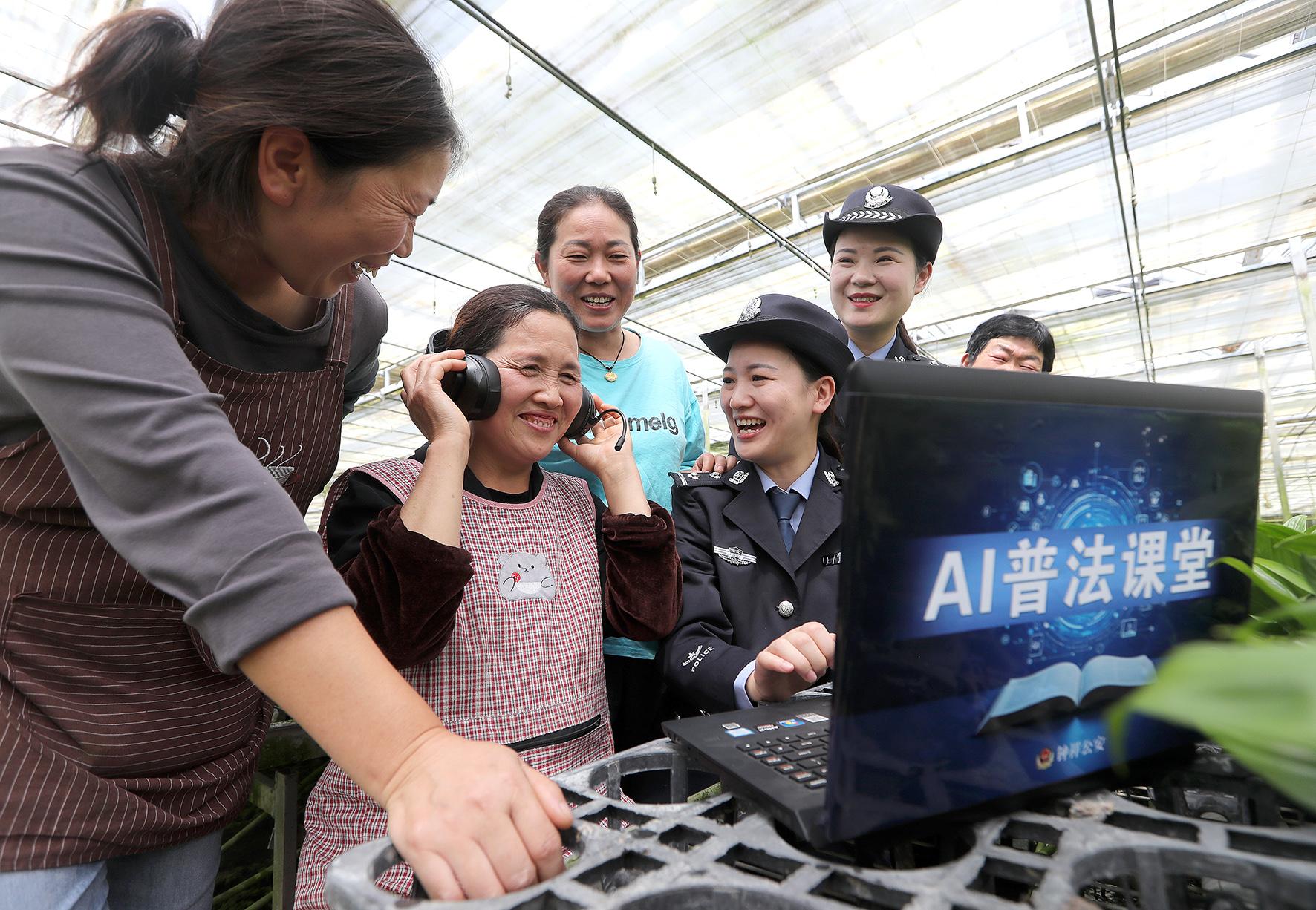圖為4月15日,民警在柴湖鎮(zhèn)羅城村花卉大棚通過AI普法課堂進行普法宣傳。