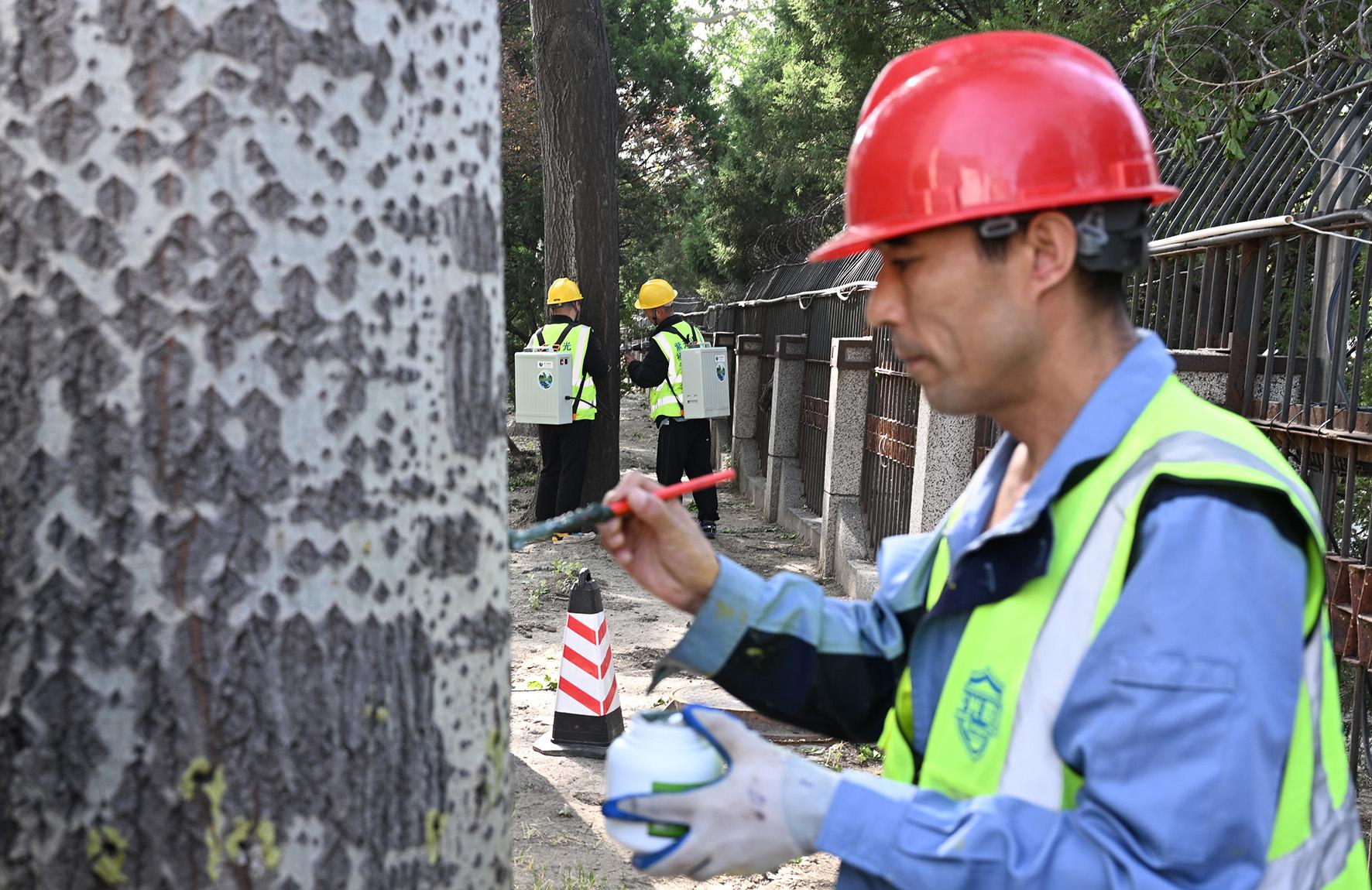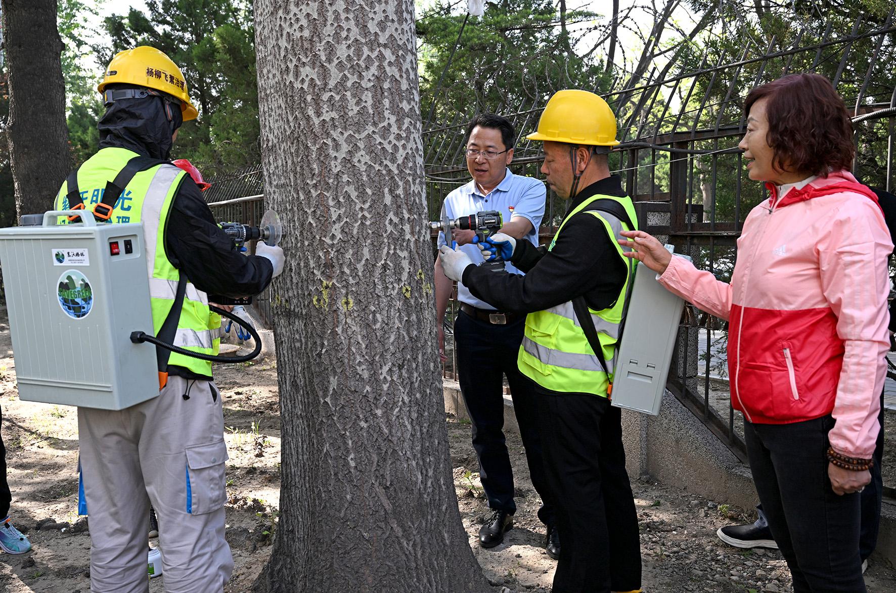 據(jù)悉,楊柳飛絮治理的藥劑由北京市園林綠化科學研究院研制,并由專業(yè)人員進行注射。