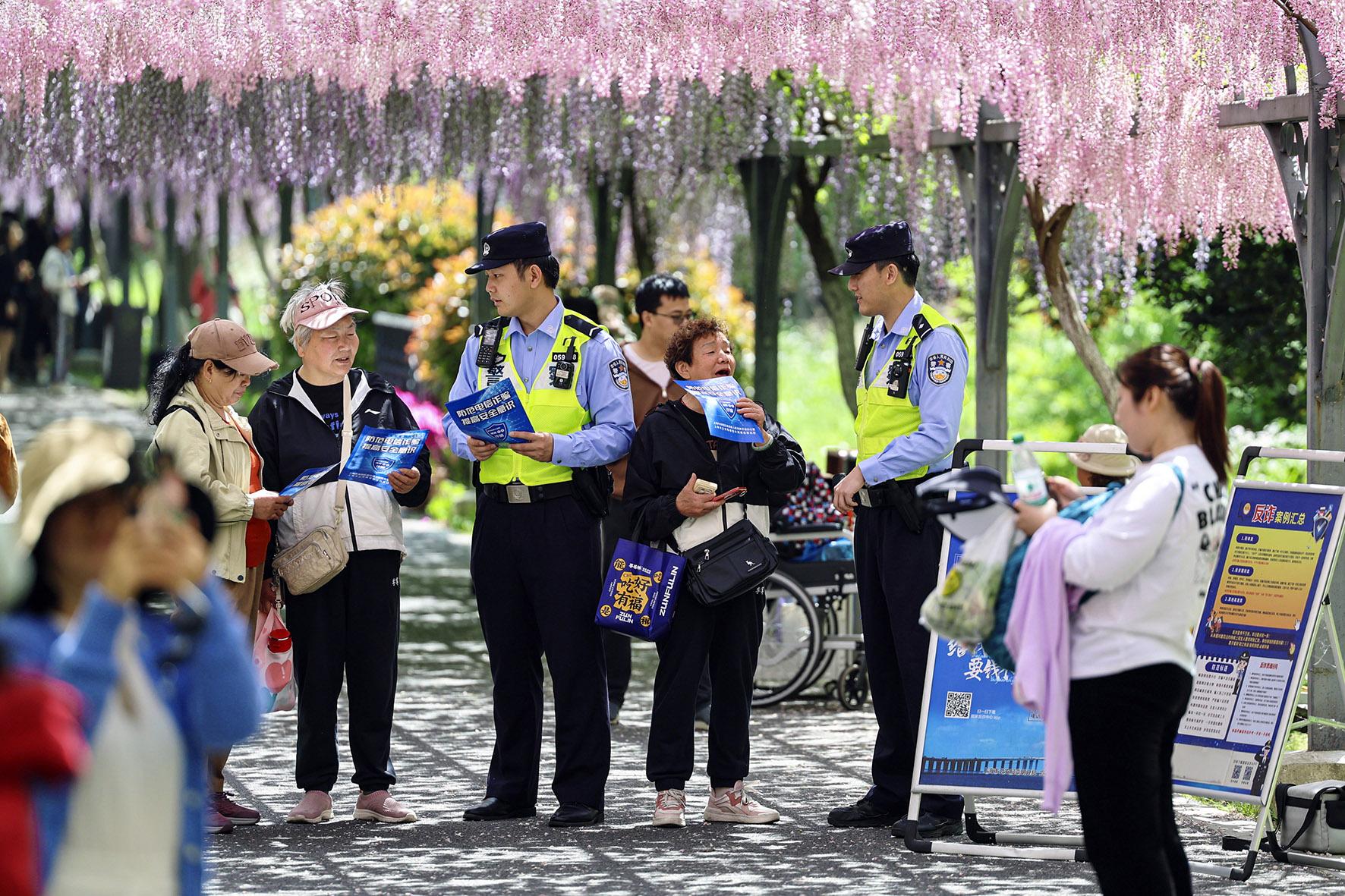 4月25日,上海市公安局崇明分局建設派出所民警來到東平國家森林公園紫藤長廊開展常態(tài)化巡邏和防范電信網絡詐騙宣傳,守護游客平安。