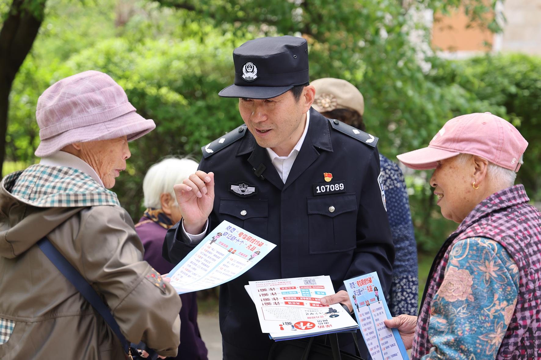 5月9日,遼寧省沈陽市公安局渾南分局五三派出所民警張德柱將反詐知識編成口訣,向居民開展互動式反詐宣傳。
