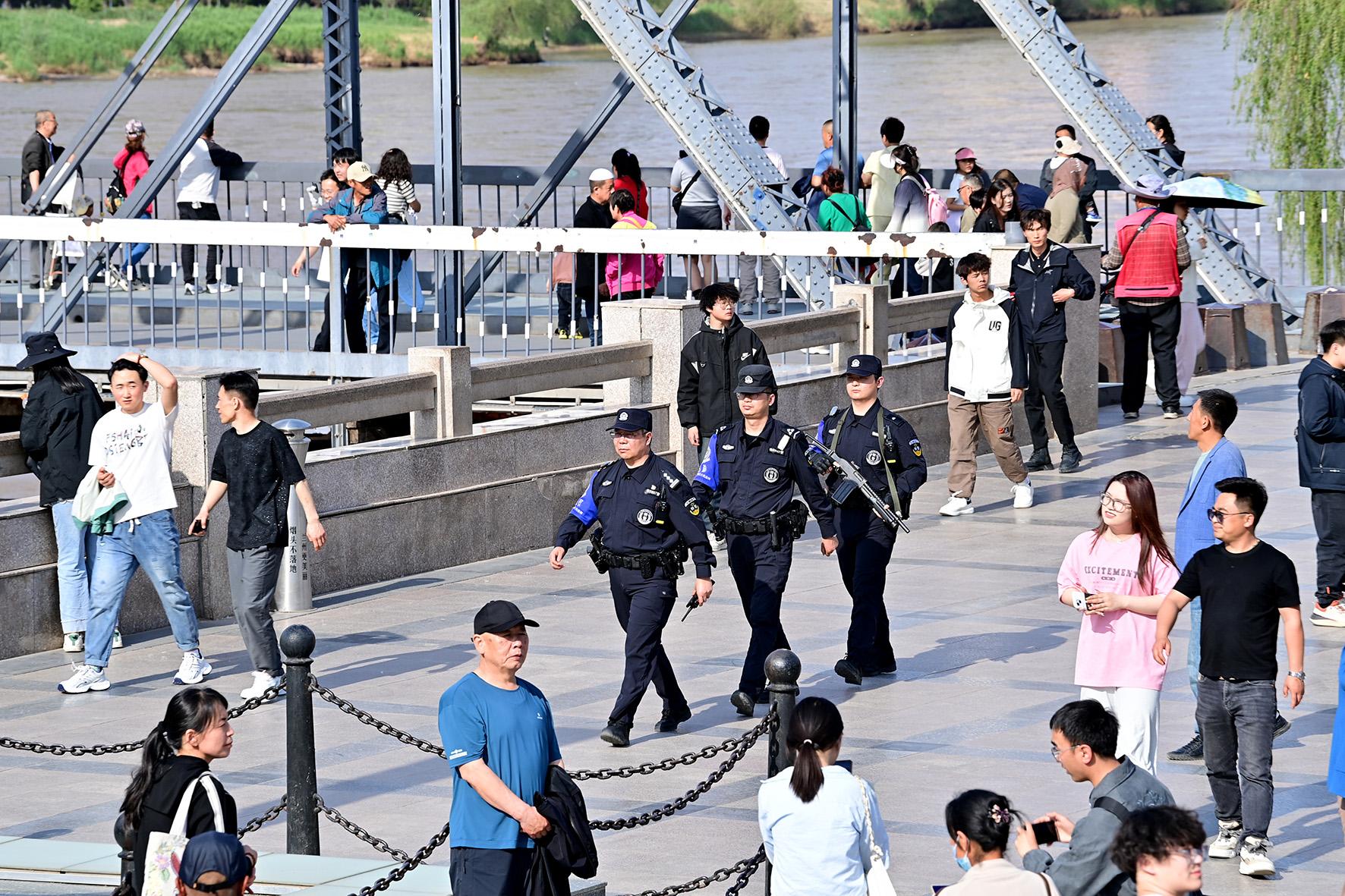 5月1日,甘肅省蘭州市公安局城關(guān)分局中山橋警務(wù)站警力在中山橋景點(diǎn)開展巡邏。