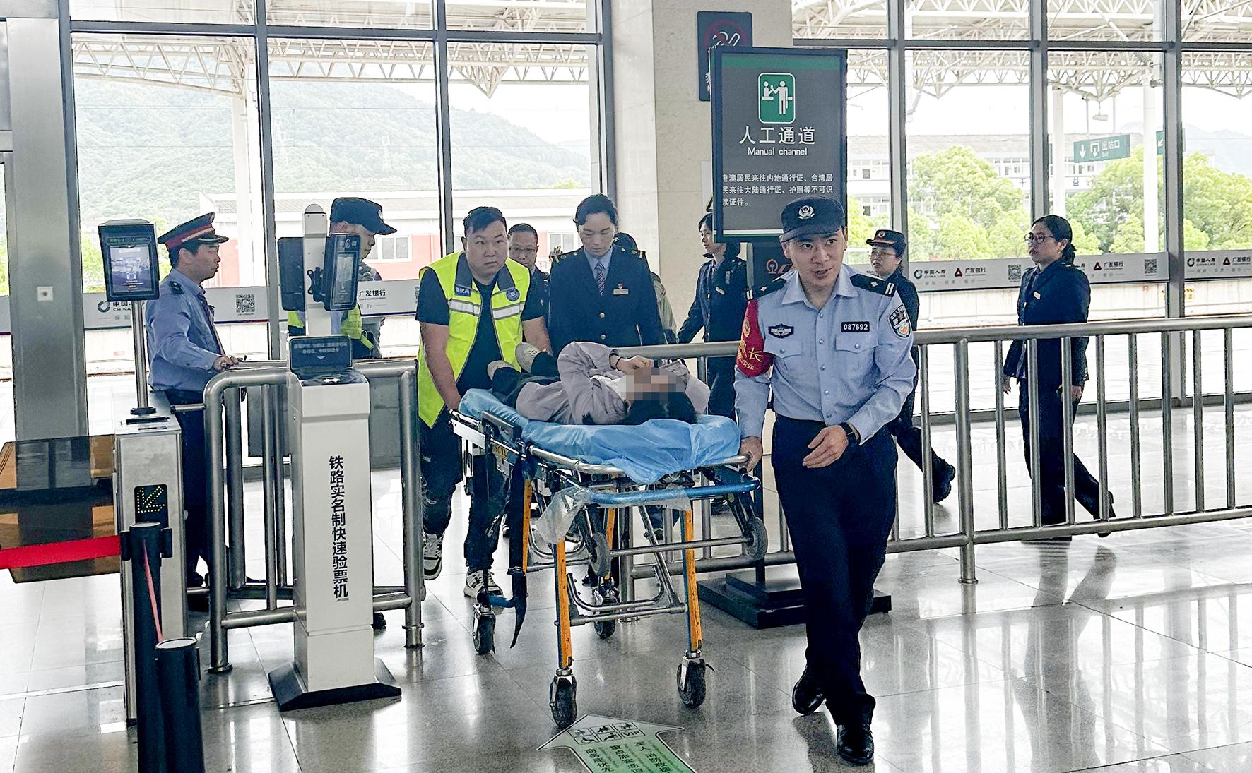 5月4日,D3301次列車一位女乘客突發(fā)疾病,杭州鐵路公安處臺(tái)州站派出所民警與醫(yī)護(hù)人員在三門站將旅客轉(zhuǎn)運(yùn)至救護(hù)車。