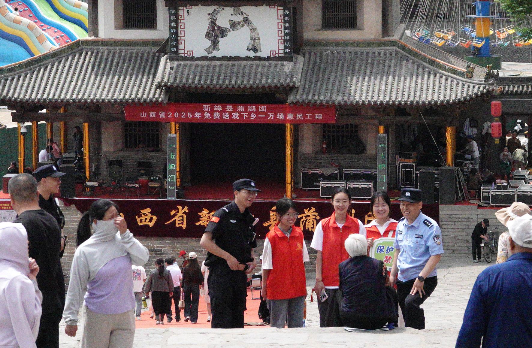 5月4日,山西省運(yùn)城市新絳縣公安局民警與志愿者在絳州署景區(qū)服務(wù)游客。