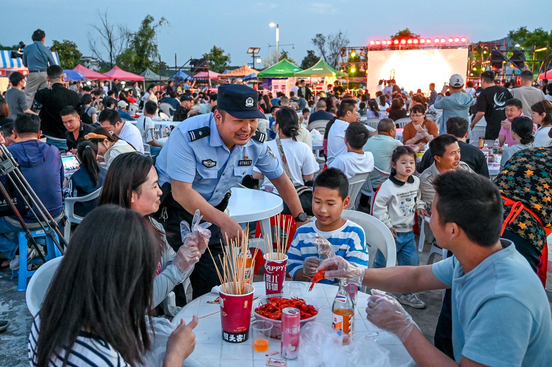5月4日,安徽省馬鞍山市和縣公安局民警在“龍蝦啤酒音樂美食季”現(xiàn)場(chǎng)為游客提供安全出行咨詢服務(wù)。