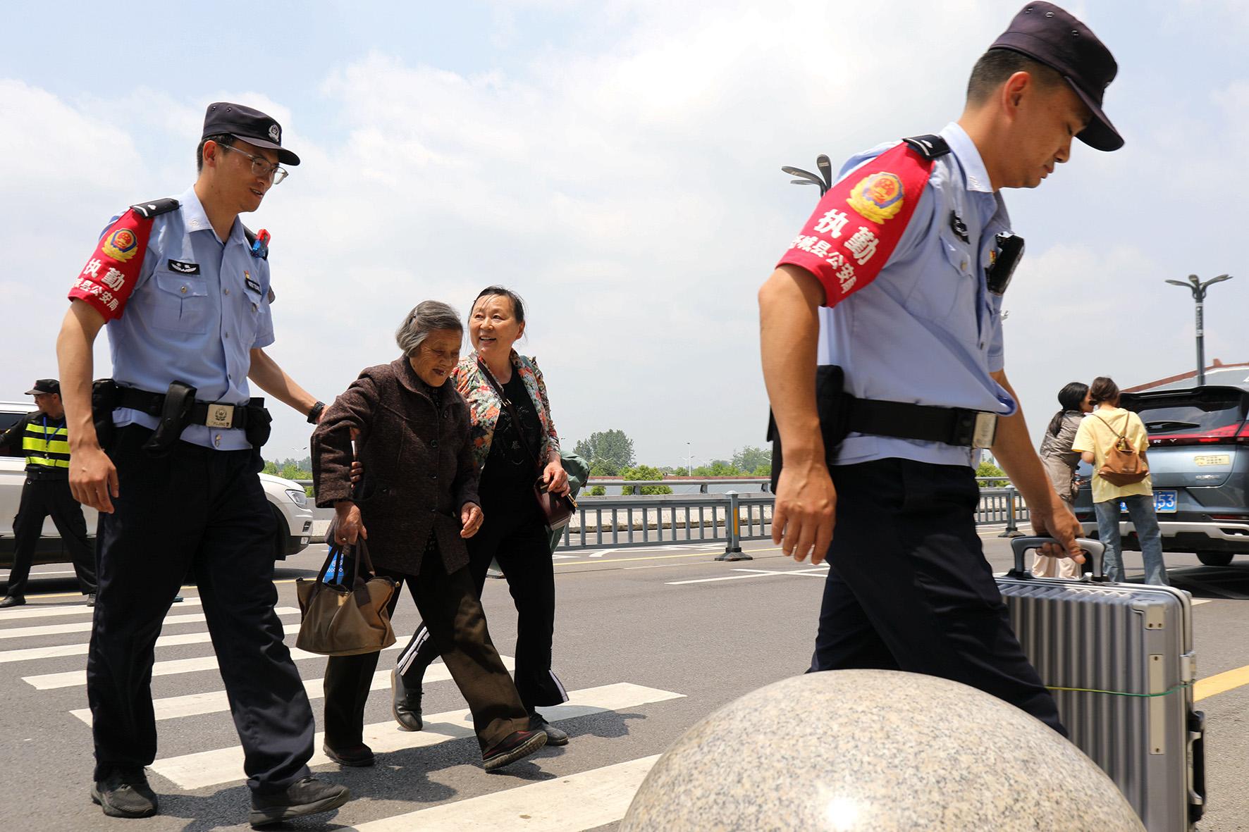 5月2日,安徽省巢湖市公安局民警攙扶老人從中廟渡口登船。