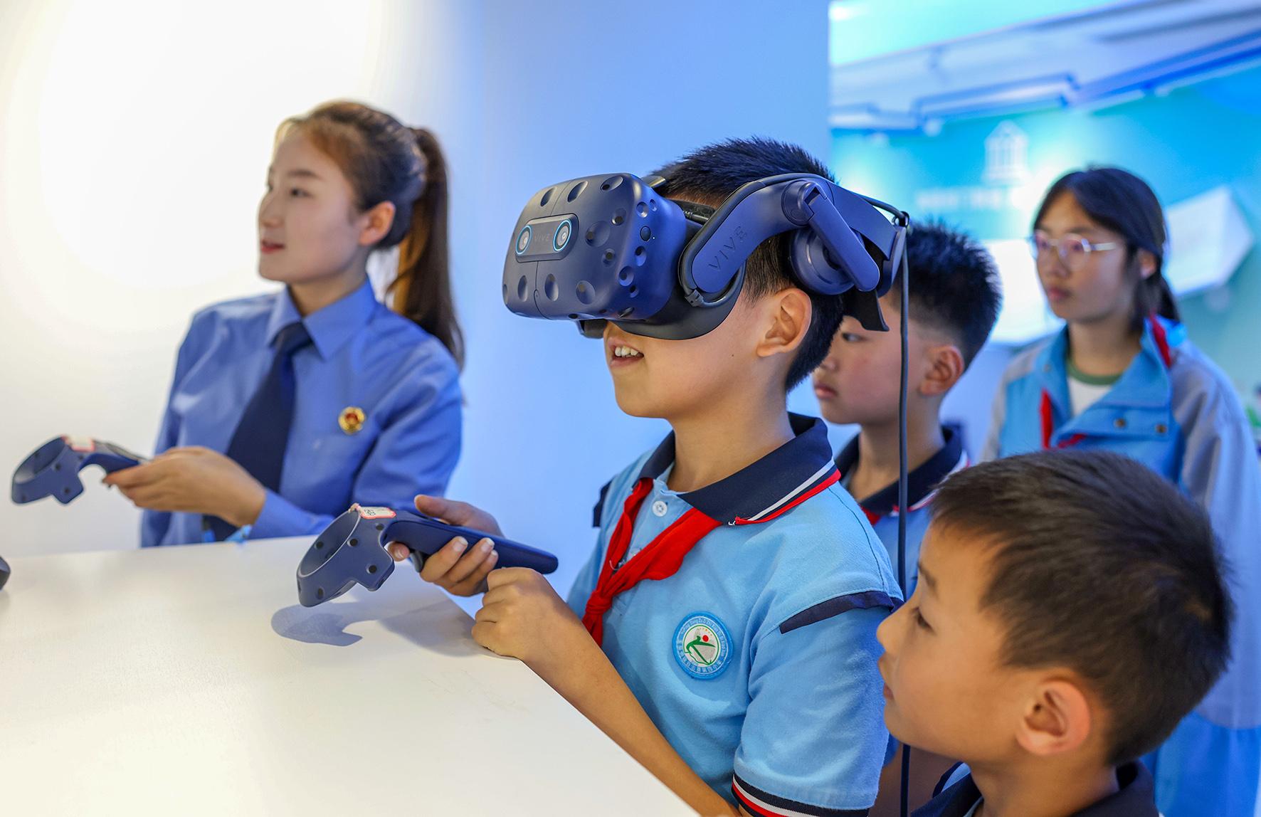 5月28日,在貴州省銅仁市玉屏侗族自治縣人民檢察院青少年法治教育基地,學生們利用VR眼鏡學習法律知識。