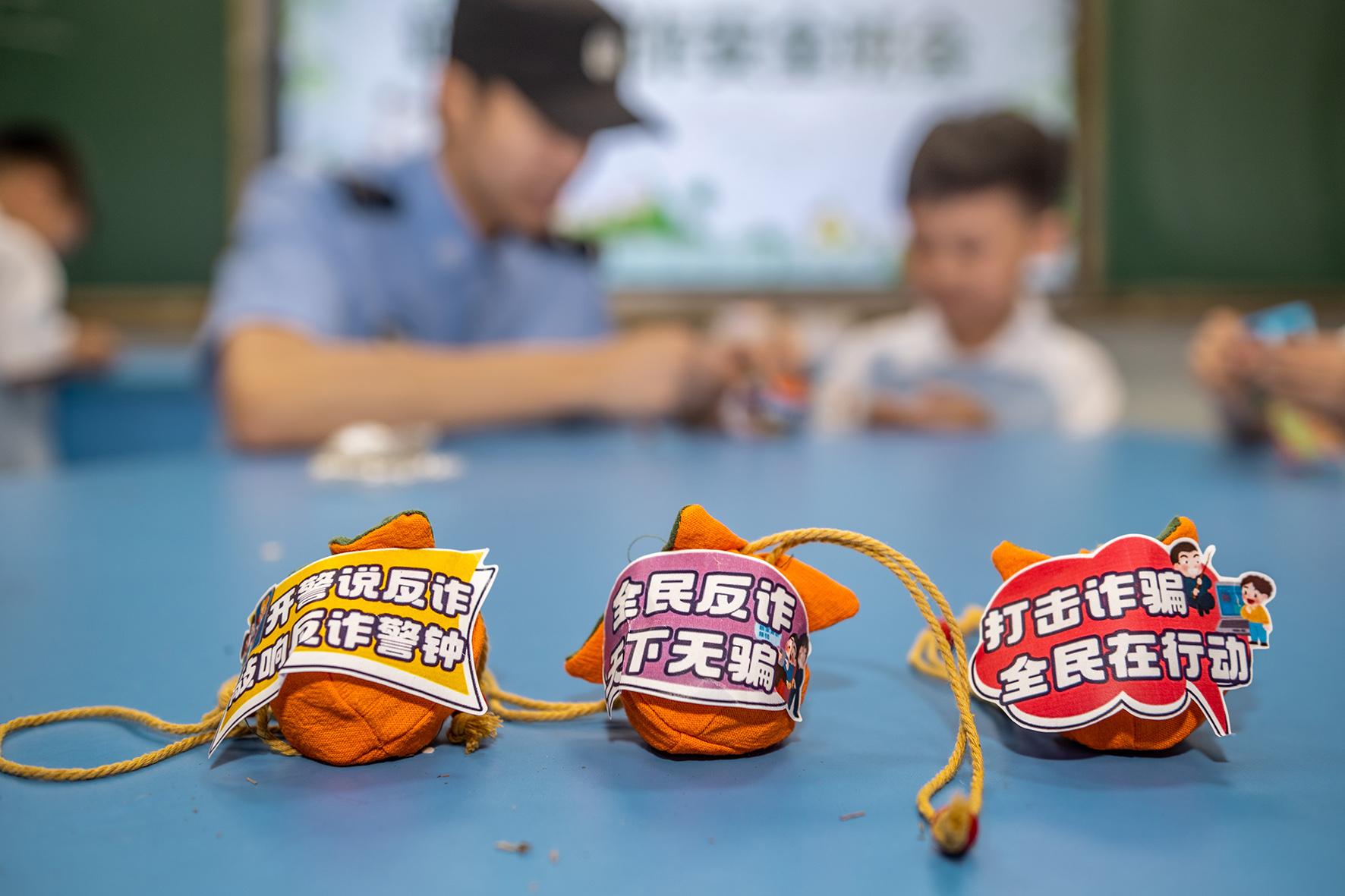 5月28日,浙江省武義縣公安局熟溪派出所民警來到轄區(qū)棲霞小學,與同學們一起動手制作“反詐香囊”。