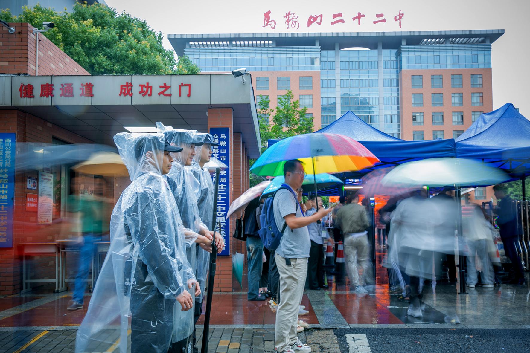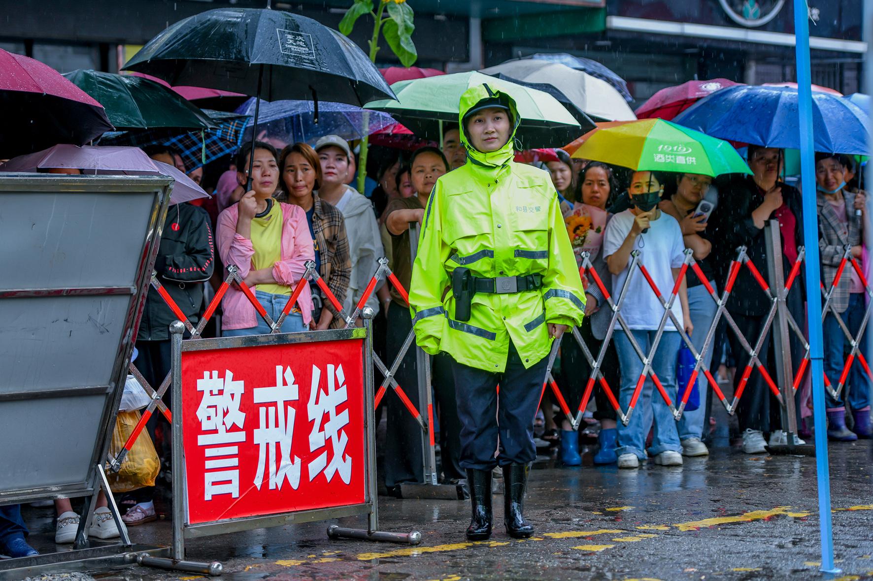 6月7日,安徽省馬鞍山市公安局雨山分局民警在考點(diǎn)外頂風(fēng)冒雨,全力維護(hù)考點(diǎn)周邊秩序。