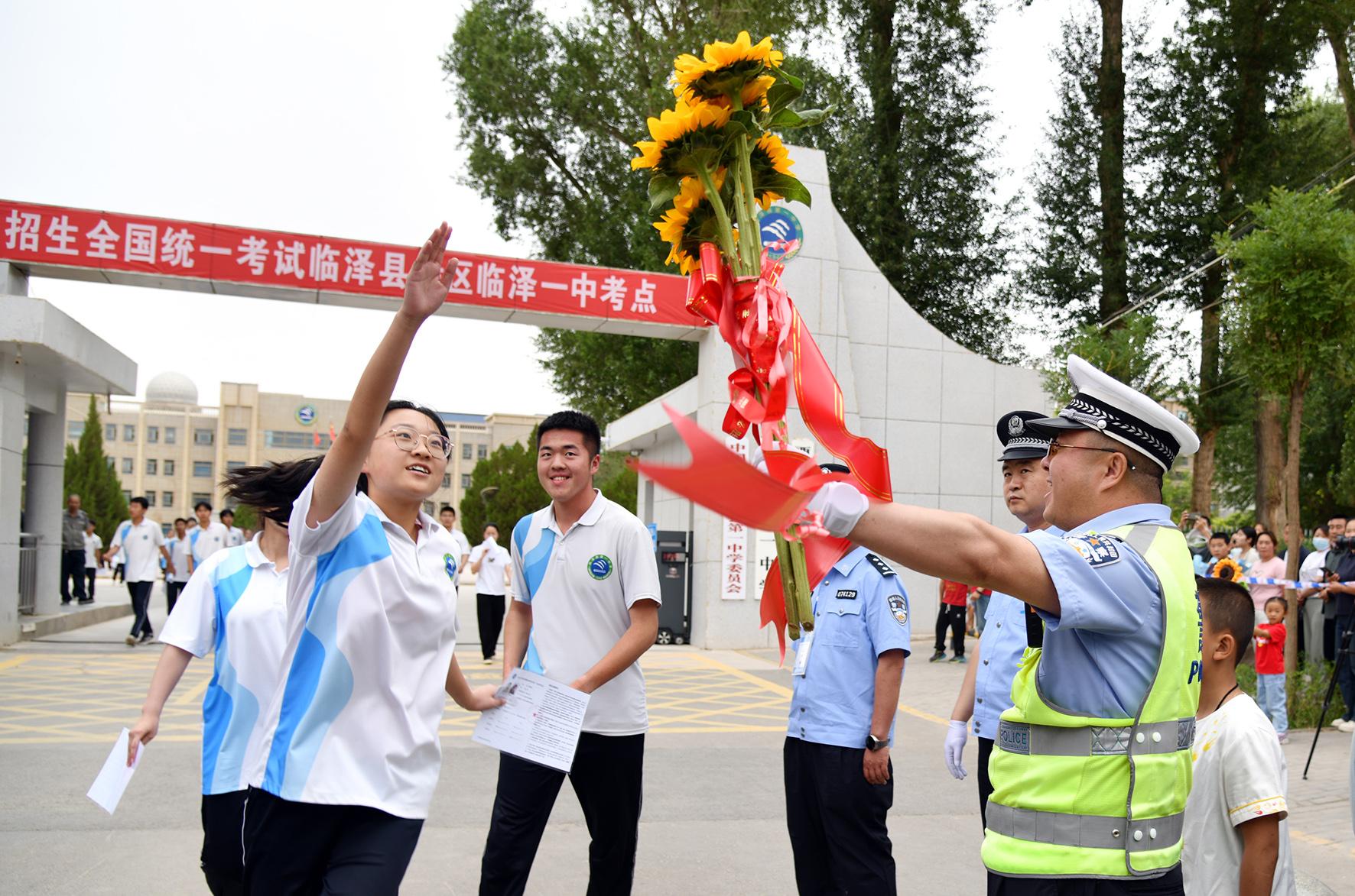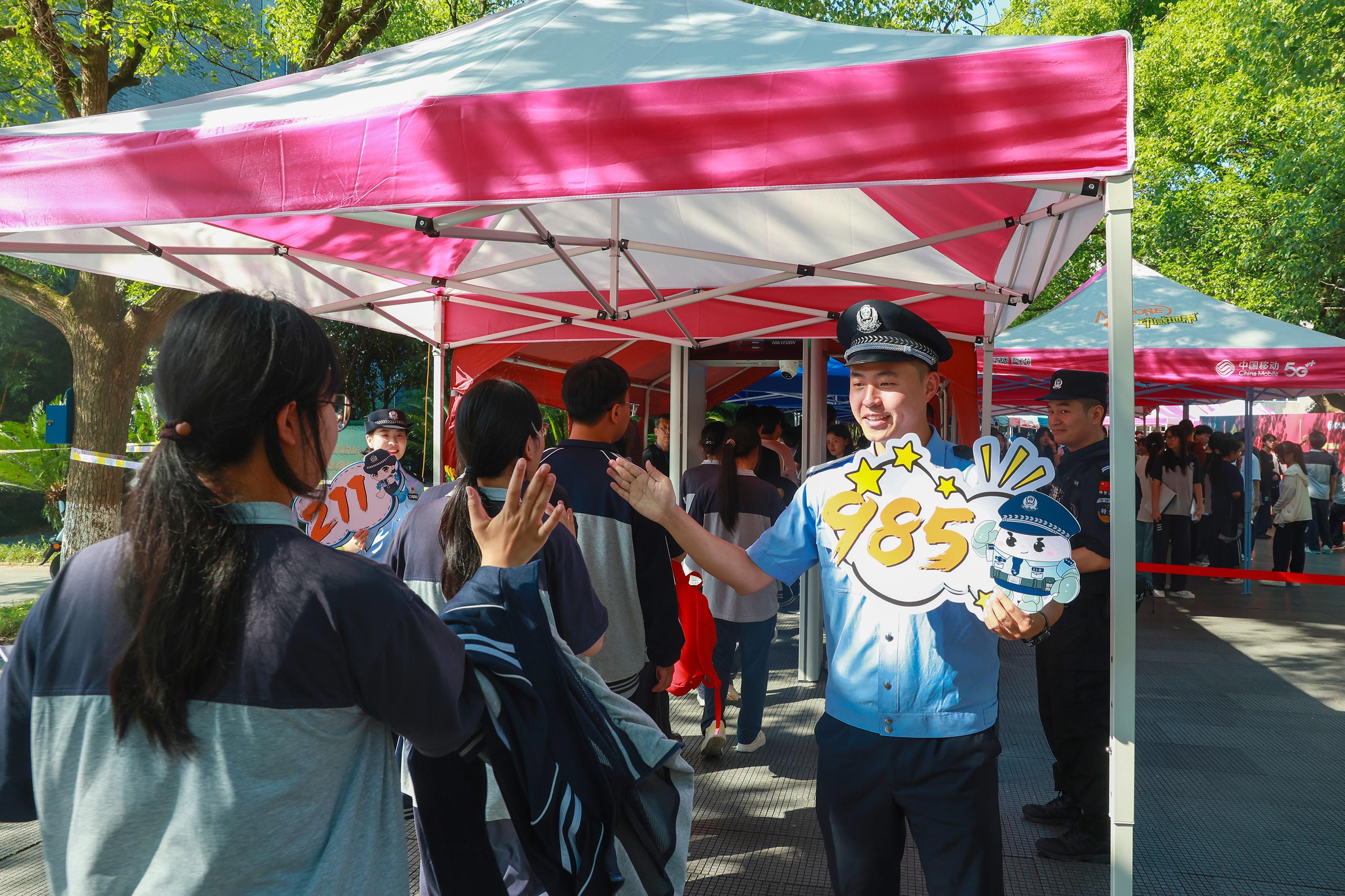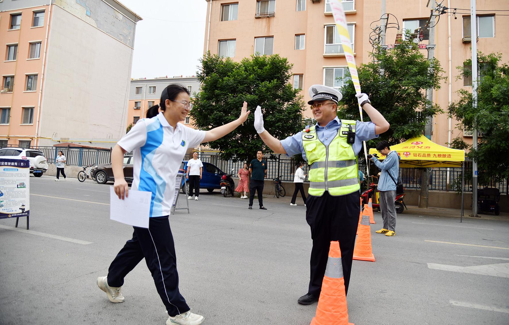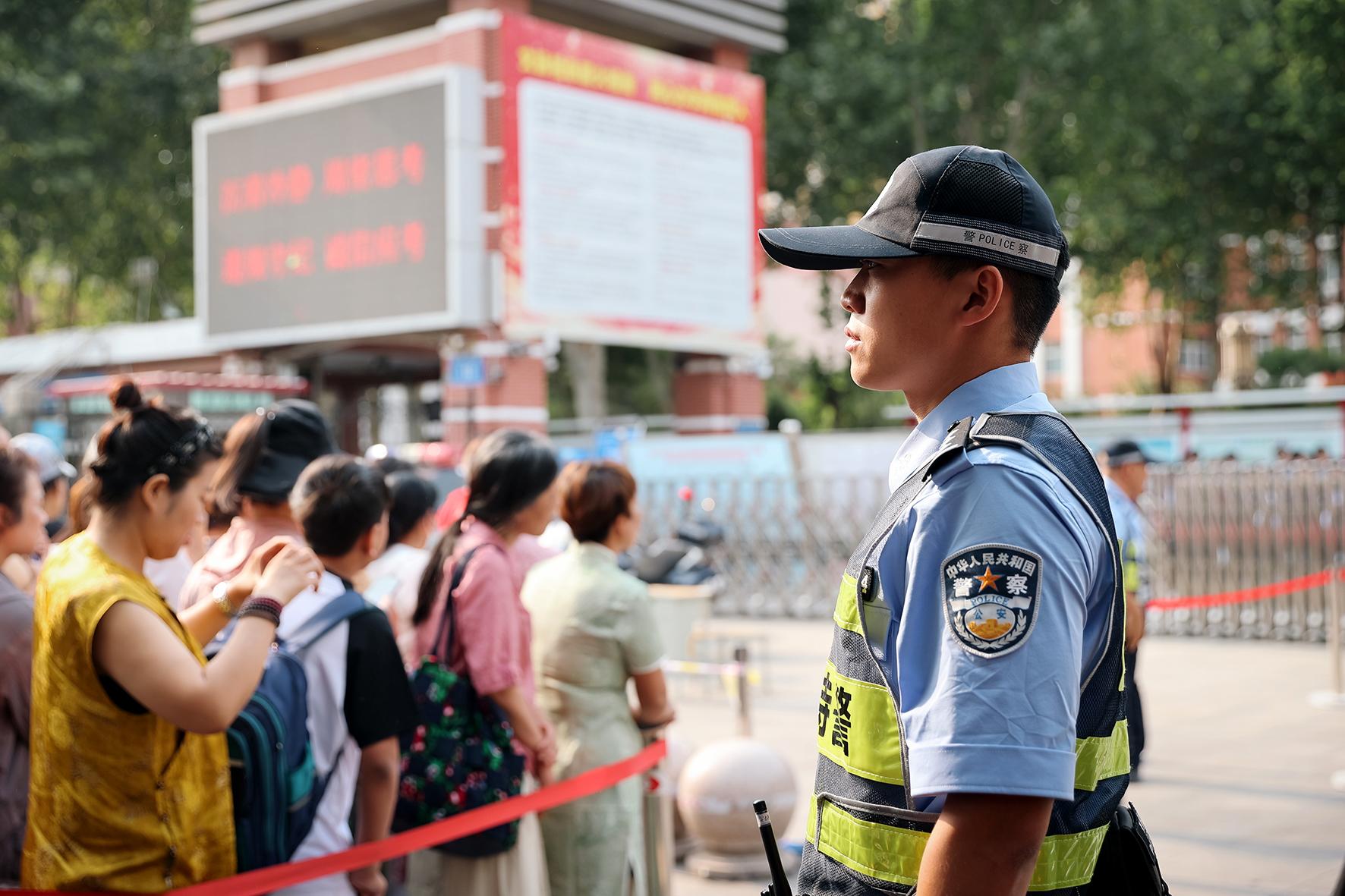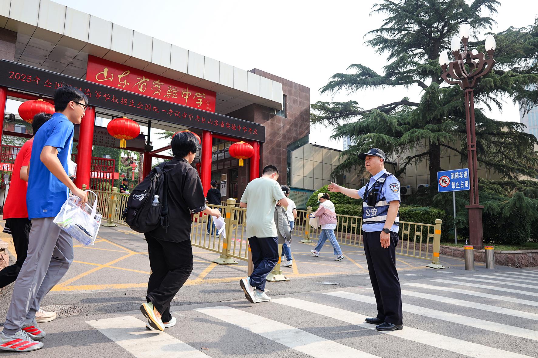 6月7日,在山東省實(shí)驗(yàn)中學(xué)考點(diǎn),濟(jì)南市公安局市中區(qū)分局桿石橋派出所執(zhí)勤民警引導(dǎo)考生有序進(jìn)場(chǎng)。
