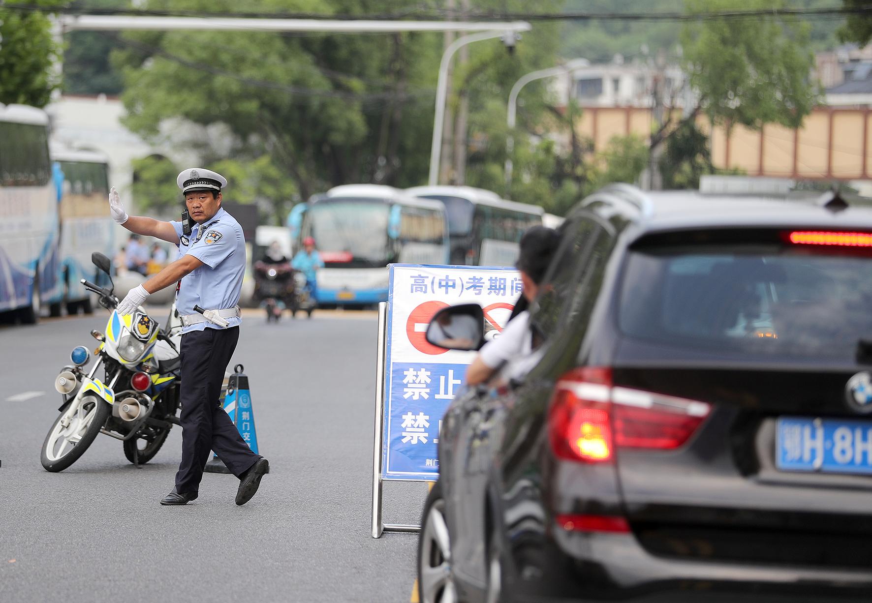 6月7日,在湖北省荊門市龍泉中學(xué)高考考點(diǎn),荊門市公安局交警支隊(duì)民警在疏導(dǎo)送考車輛。