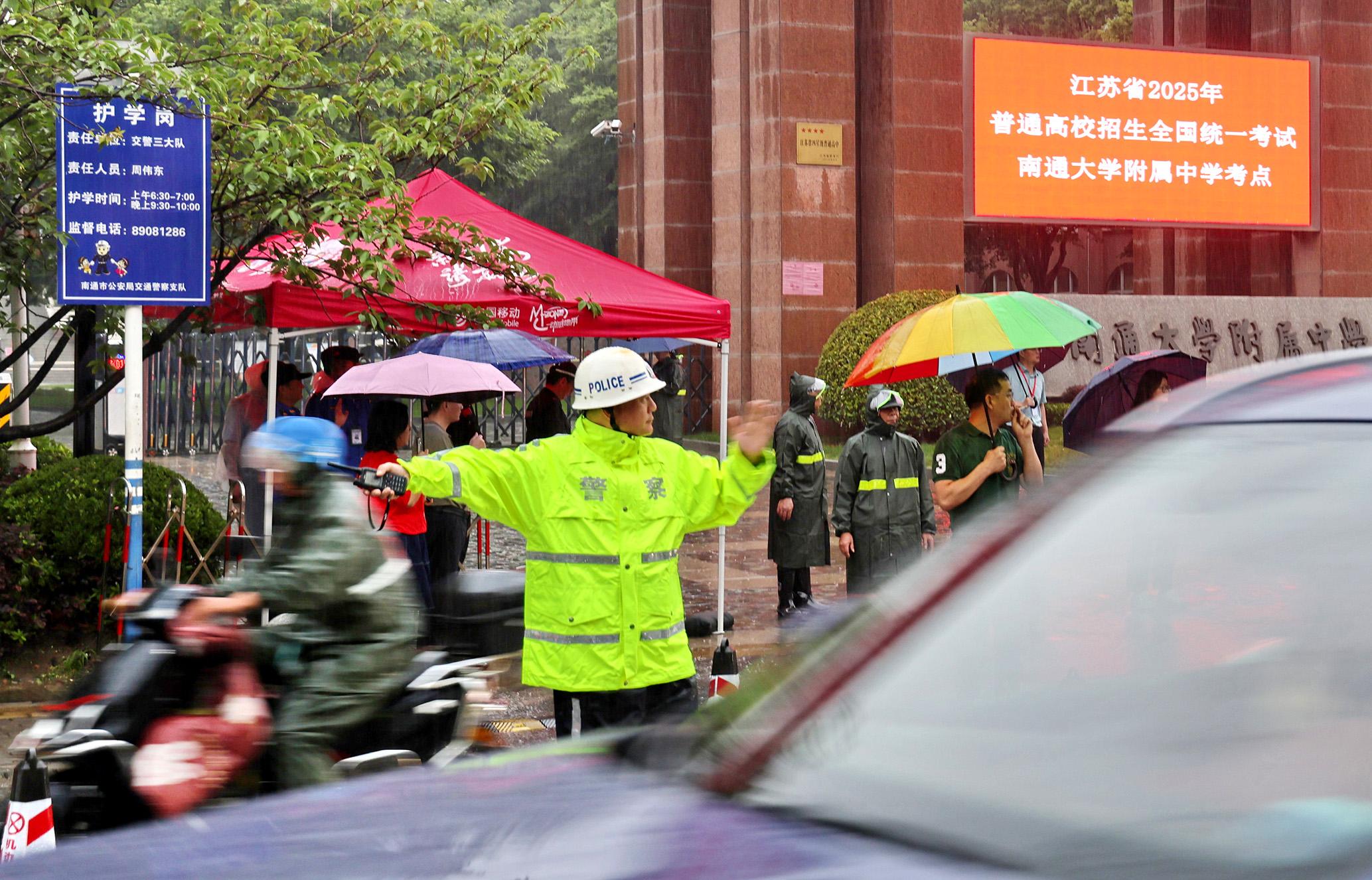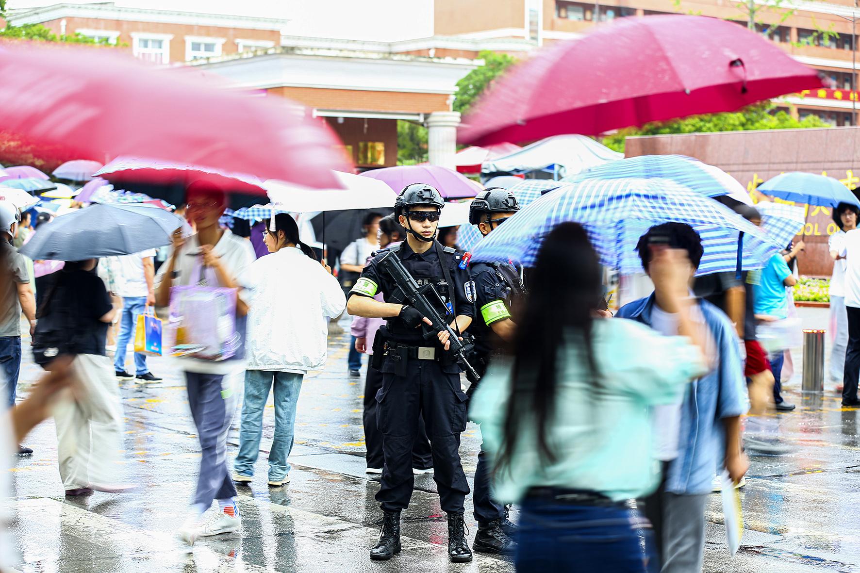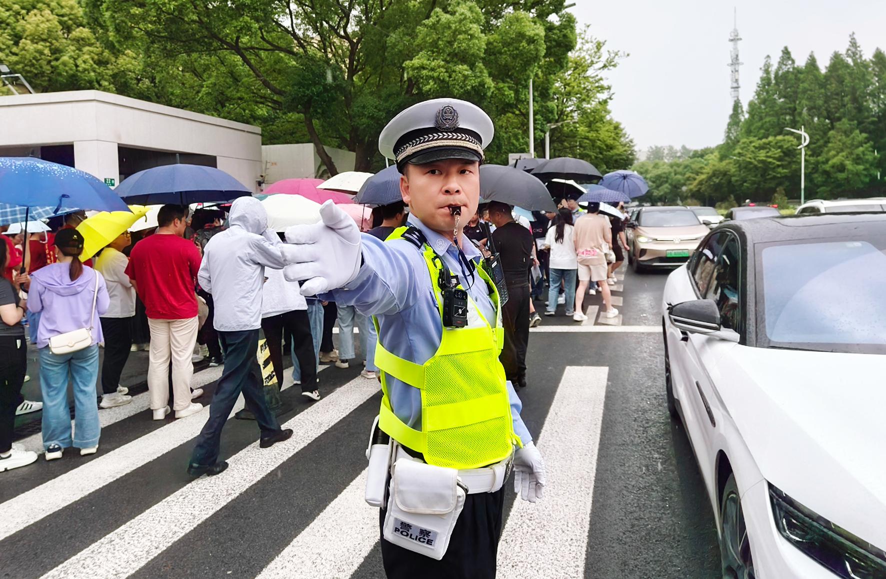 6月7日,江蘇省南通市在雨中迎來(lái)高考。南通市公安局民警全警動(dòng)員,堅(jiān)守崗位,護(hù)航學(xué)子圓夢(mèng)。
