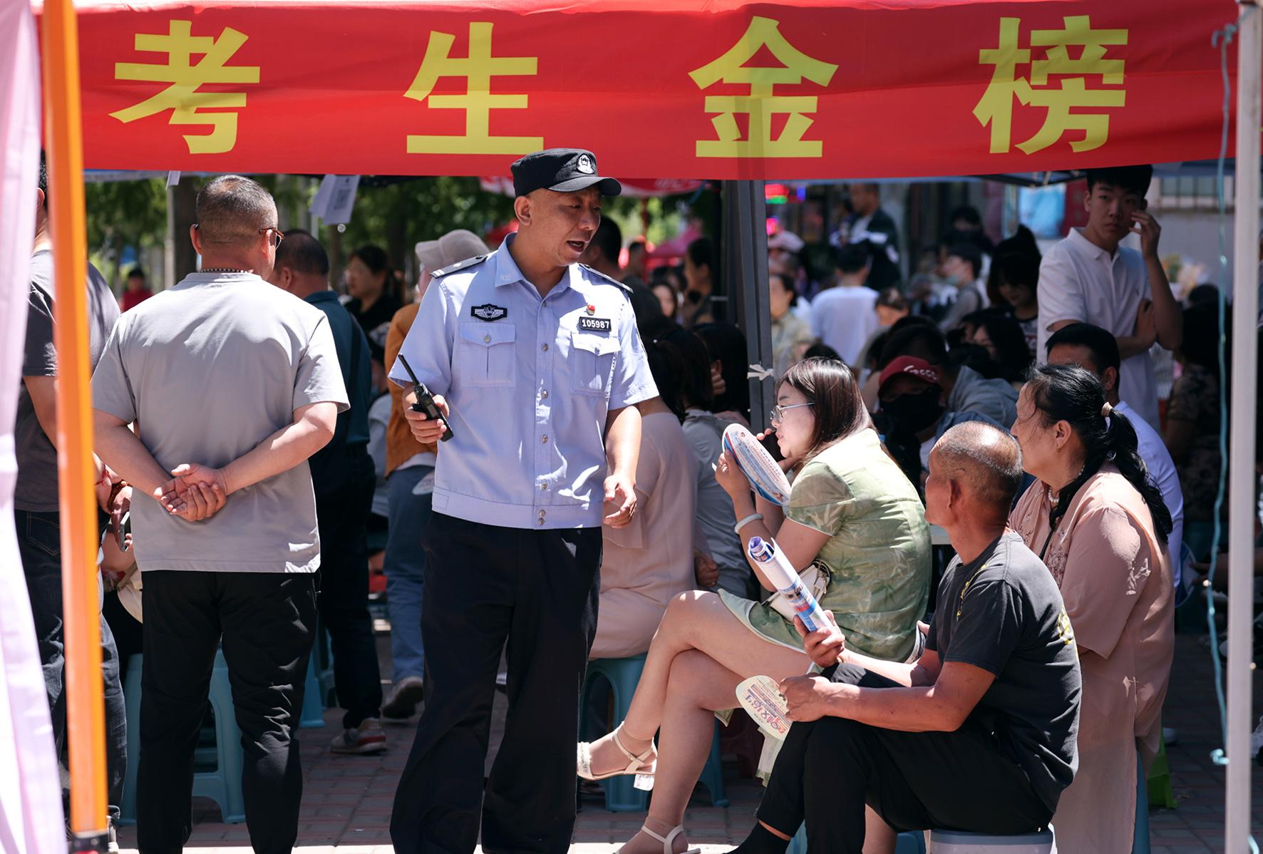 6月7日,遼寧省沈陽(yáng)市公安局沈北分局新城子街派出所民警為考生家長(zhǎng)提供服務(wù)。