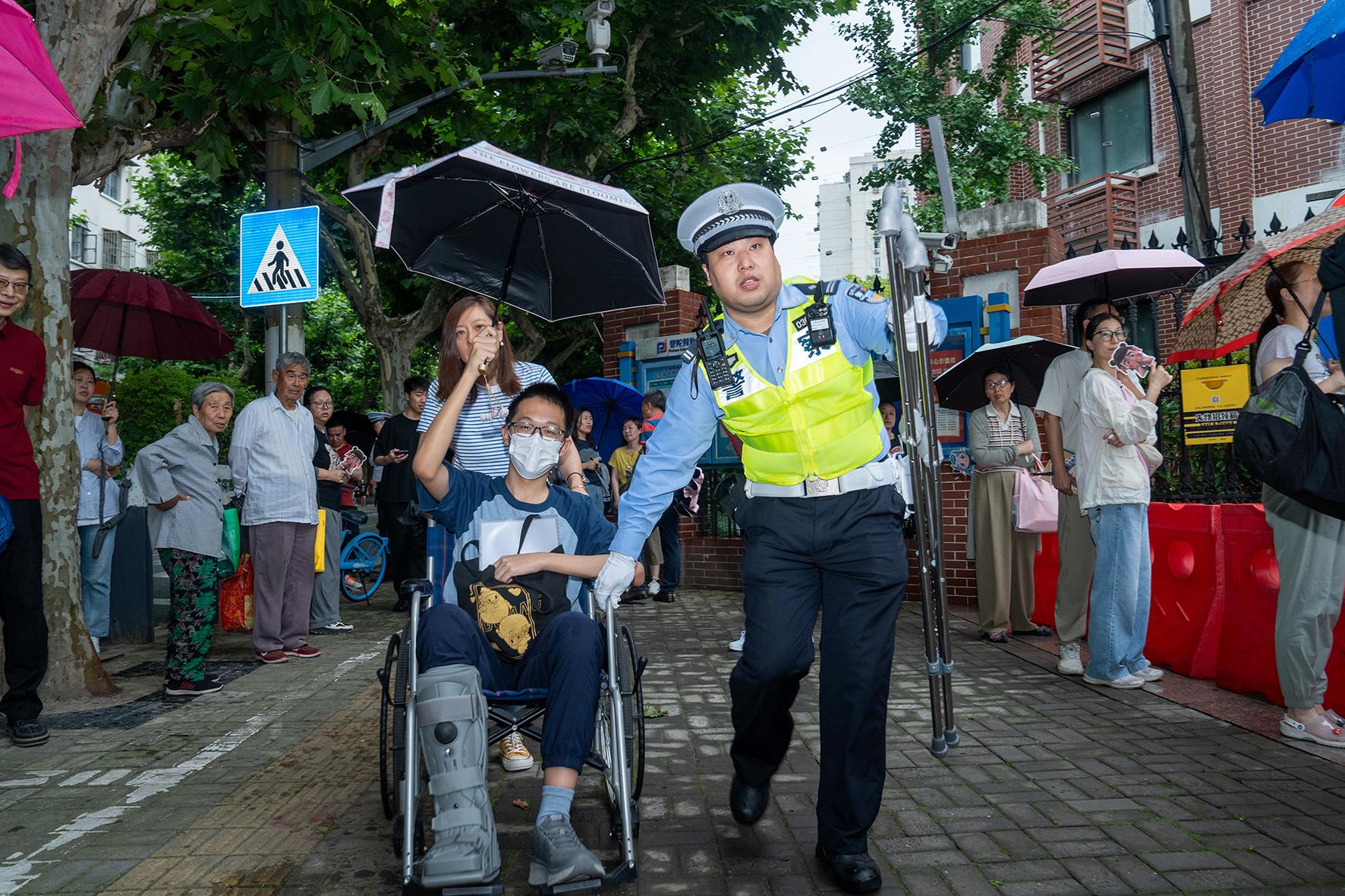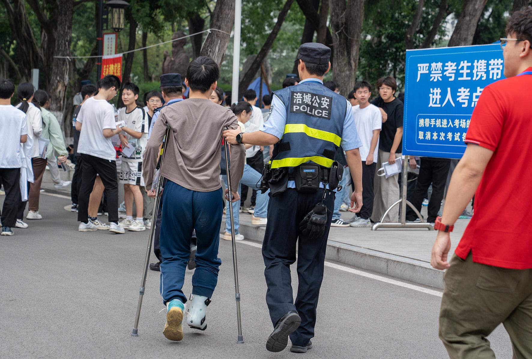 6月7日,陜西省富平縣公安局執(zhí)勤民輔警正在幫助受傷考生進(jìn)入考場(chǎng)。