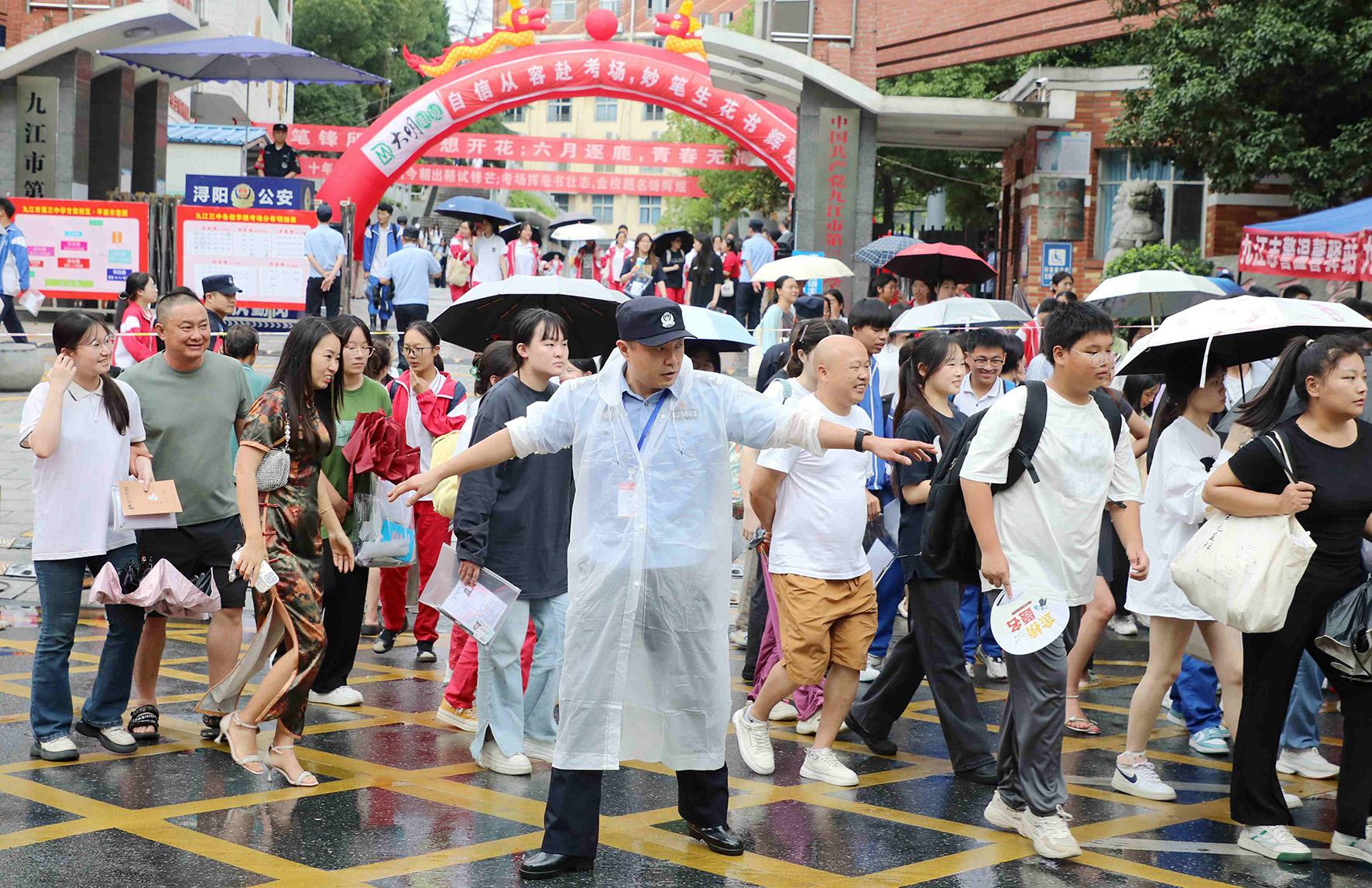 6月8日,江西省九江市公安局潯陽(yáng)分局民輔警冒雨在九江市三中考點(diǎn)指揮疏導(dǎo)交通。