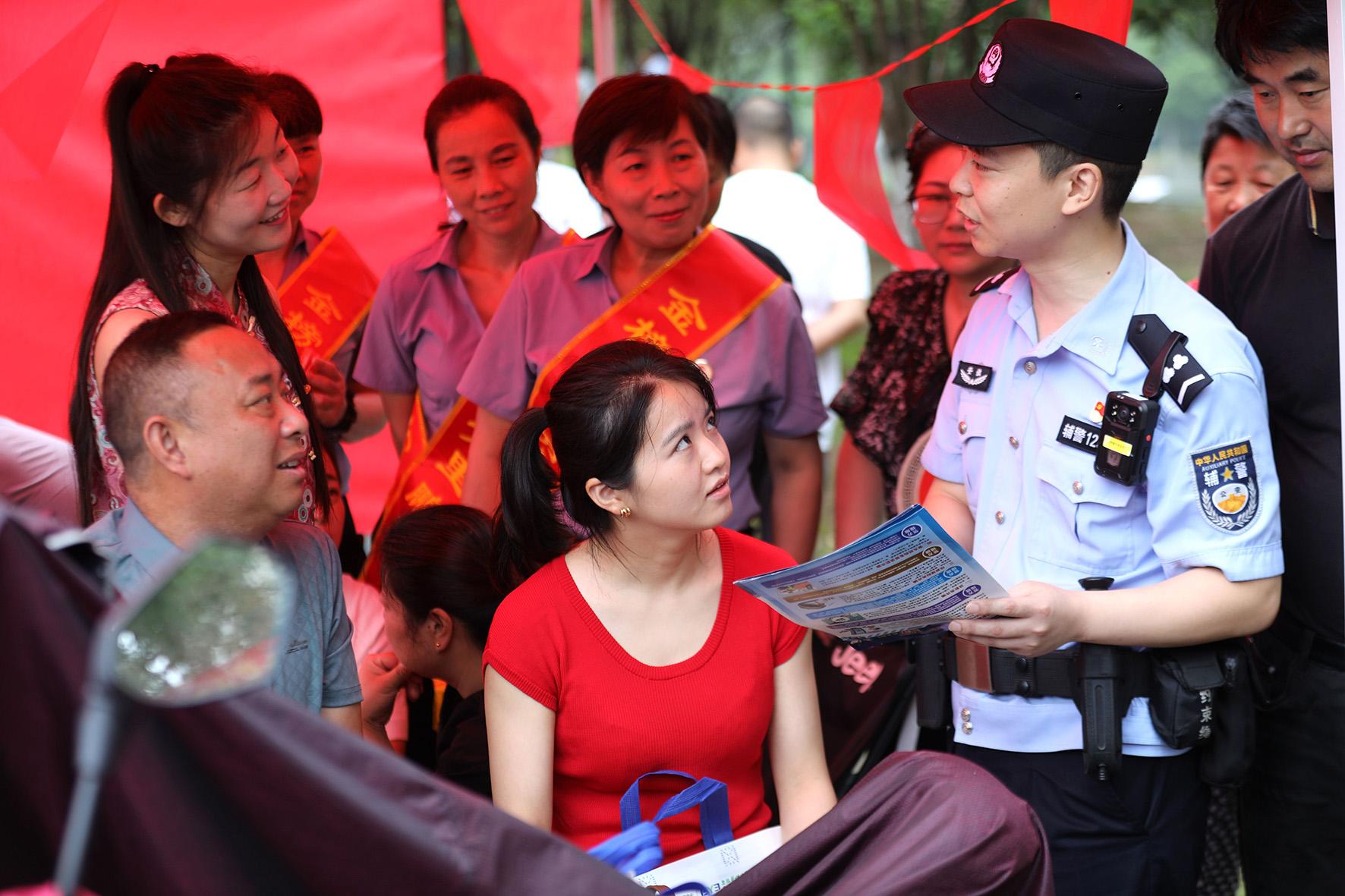6月8日,安徽省舒城縣公安局經(jīng)濟(jì)技術(shù)開(kāi)發(fā)區(qū)派出所民輔警向等候的家長(zhǎng)開(kāi)展防范涉高考詐騙知識(shí)宣傳。