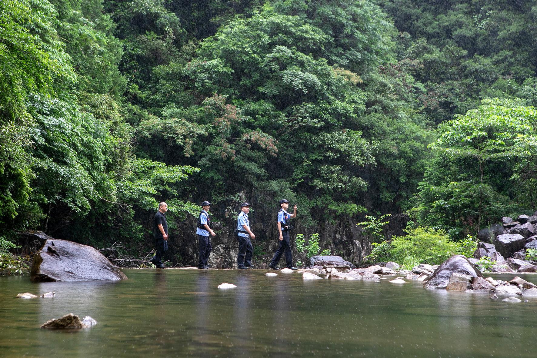 圖為6月12日,寧溪派出所大寺基生態(tài)警務站民警和生態(tài)保護志愿者一起在大寺基林場的深山中巡邏。
