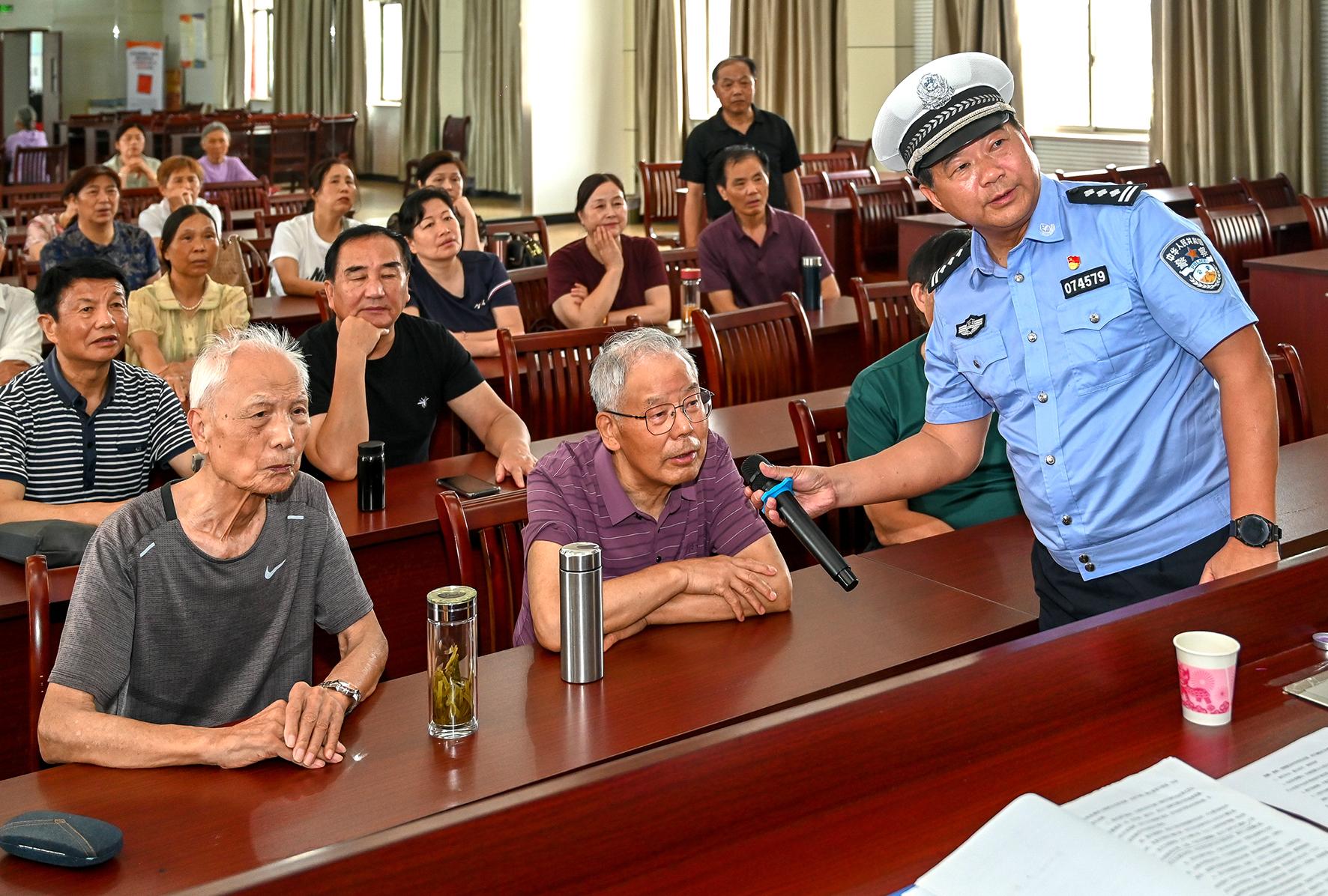 6月23日,在安徽省馬鞍山市和縣老年大學(xué),全國公安系統(tǒng)二級英雄模范、和縣公安局交管大隊(duì)民警杜昌來正在給老年大學(xué)的學(xué)員開展交通安全專題講座。