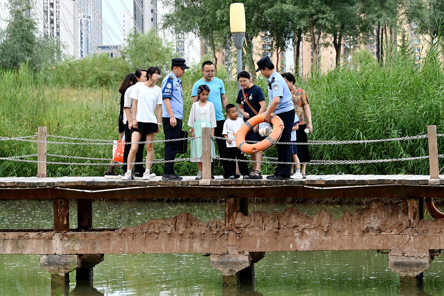 6月28日,甘肅省蘭州市公安局安寧分局銀灘路派出所民警,在轄區(qū)濕地公園加強重點水域的巡邏管控,向游客宣傳防溺水安全知識。