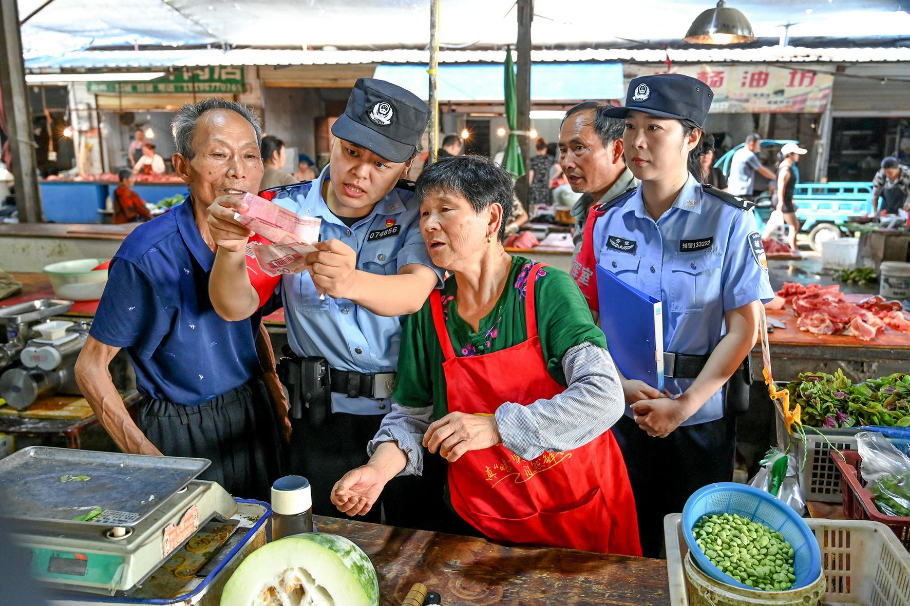 7月4日,安徽省馬鞍山市和縣公安局經(jīng)偵大隊(duì)民警在農(nóng)貿(mào)市場(chǎng)向群眾開(kāi)展識(shí)別假幣宣傳,通過(guò)傳授“一轉(zhuǎn)二摸三透光”小妙招,提升群眾識(shí)假能力,筑牢安全防線。