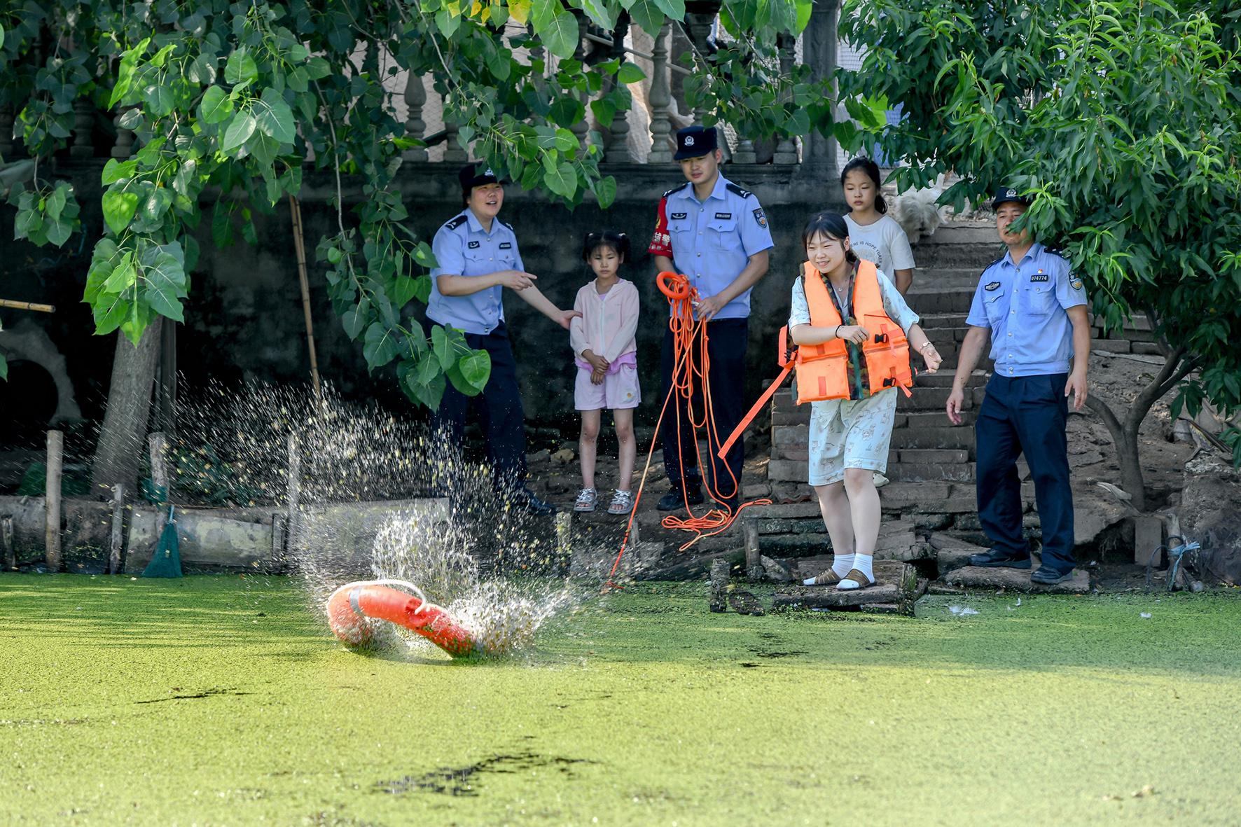 7月6日,在安徽省馬鞍山市和縣歷陽鎮(zhèn)萬壽村,和縣公安局“村警”向未成年人講解“防溺水”知識,傳授救生設(shè)備的使用方法。