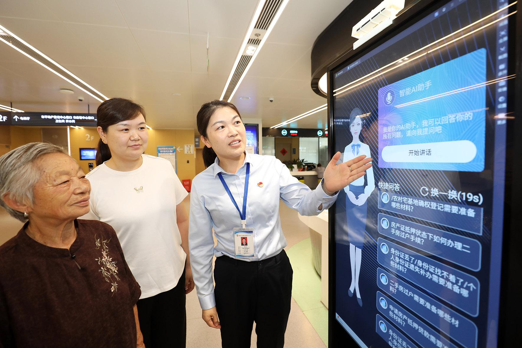 7月15日,安徽省淮北市政務(wù)服務(wù)大廳不動產(chǎn)登記窗口工作人員利用“智能AI助手”指導(dǎo)辦事群眾進行咨詢業(yè)務(wù)。當日,淮北市政務(wù)服務(wù)大廳不動產(chǎn)登記窗口“智能AI助手”投入使用,設(shè)備具有智能詢問解答導(dǎo)服功能,支持辦事群眾通過快捷、語音等多種方式進行交互。