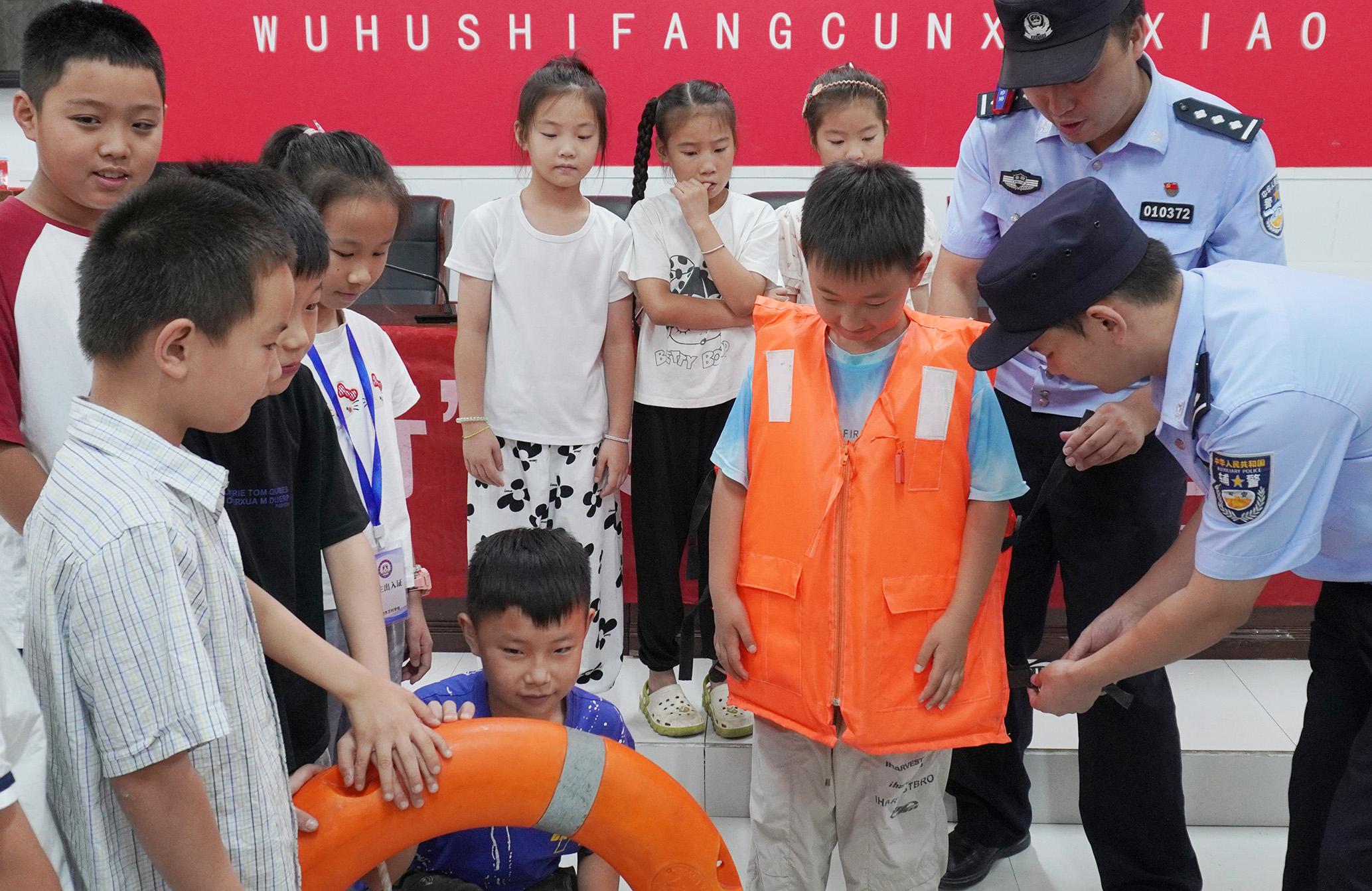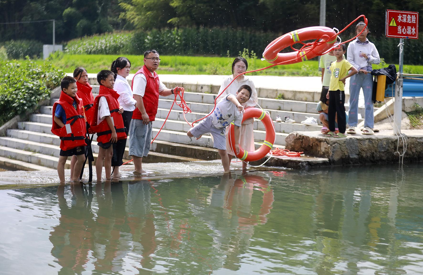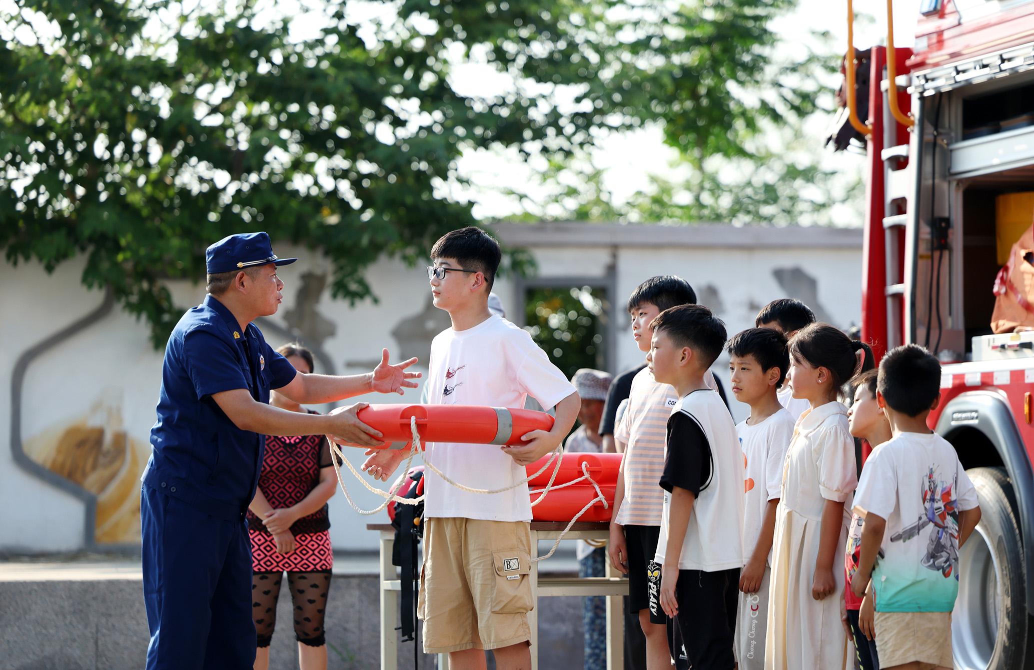 7月17日,在山東省臨沂市郯城縣郯城街道陵坡村,消防救援人員為放暑假的孩子們講解防溺水知識(shí)。