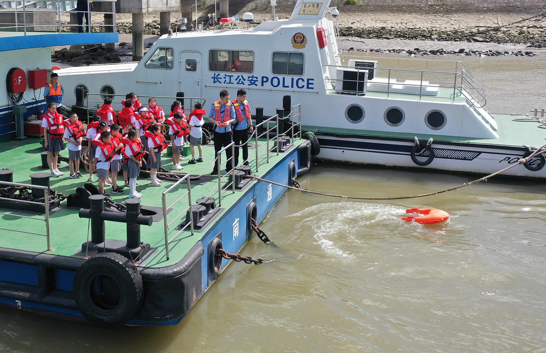 7月23日,長(zhǎng)江航運(yùn)公安局南通分局通州派出所民警在水上執(zhí)法基地為愛心暑托班的孩子們宣講防溺水安全知識(shí)。