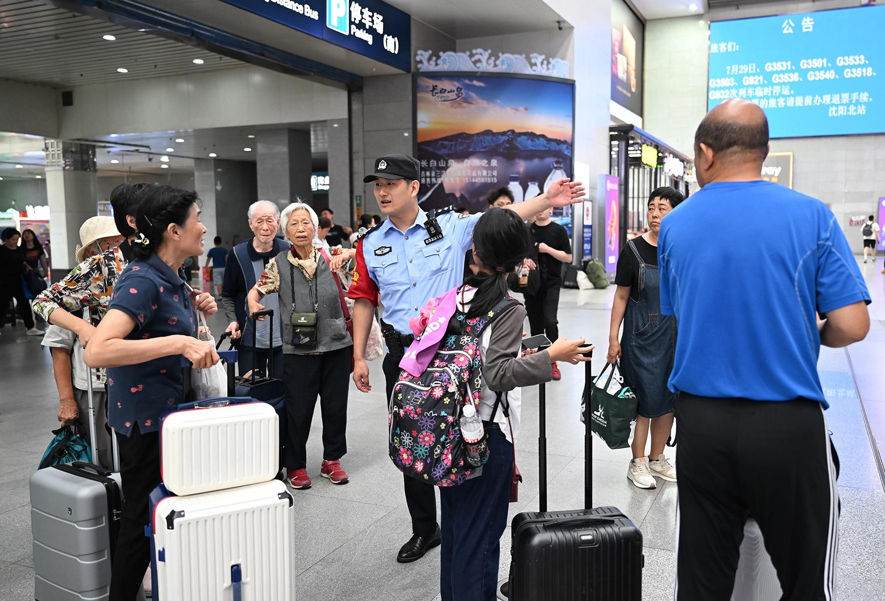 7月29日,沈陽鐵路公安處沈陽北站派出所針對暑運期間學生流、家庭游旅客流激增的情況,增派警力在候車室開展安全提醒服務。