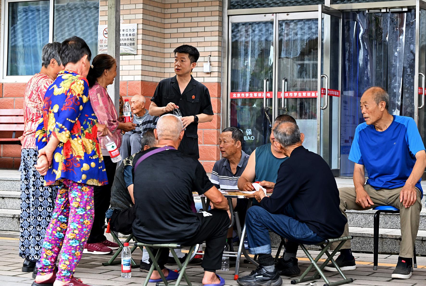 8月4日,北京市懷柔區(qū)學生軍訓基地安置點,懷柔區(qū)人民法院防汛小分隊成員、湯河口法庭副庭長周科熱情地與來自楊樹下村的池大媽打著招呼。今年5月,周科帶隊去楊樹下村開展民法典宣傳月普法活動。