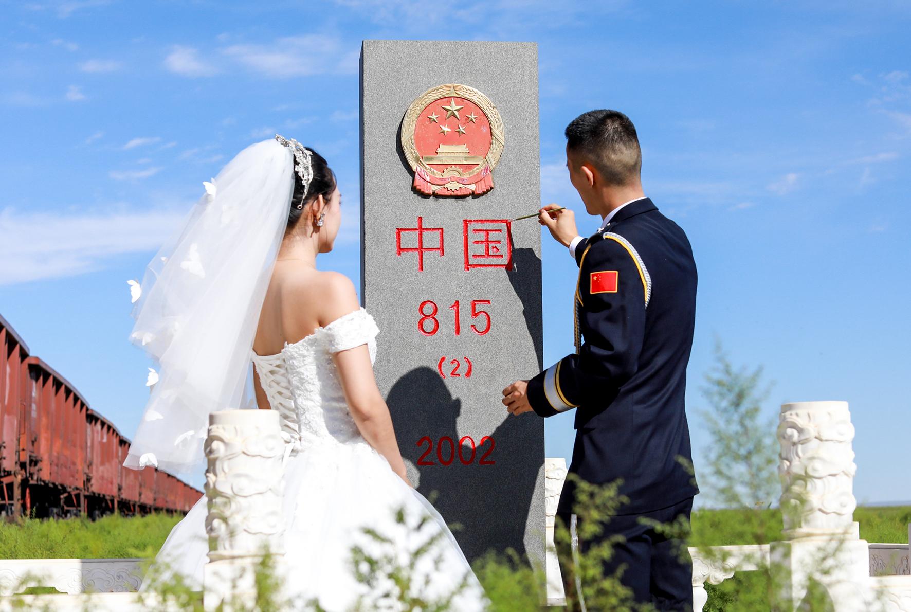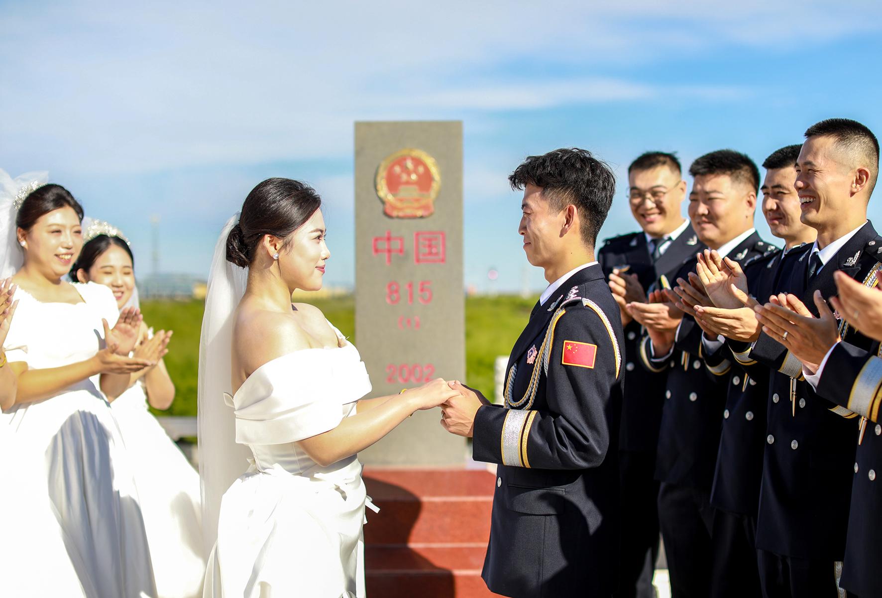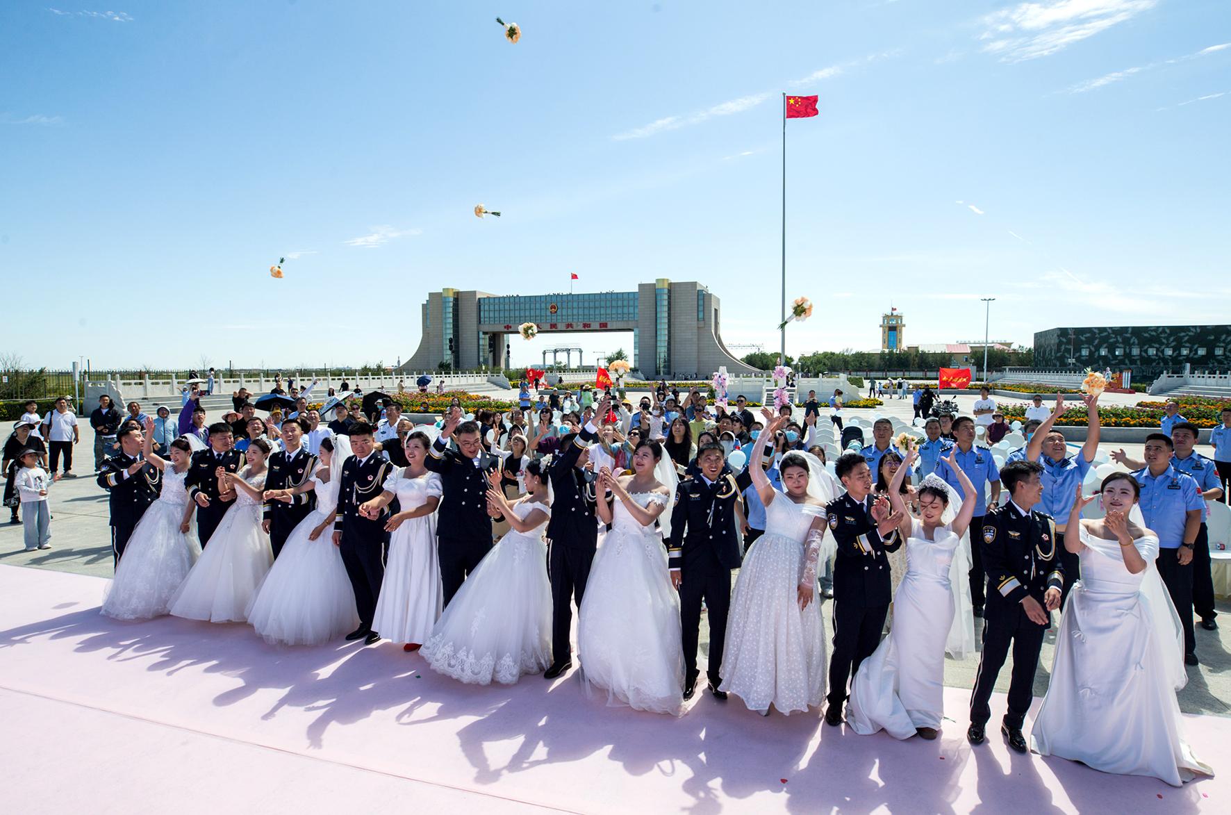 8月16日,內(nèi)蒙古出入境邊防檢查總站二連出入境邊防檢查站隆重舉辦第六屆“愛在北疆 情定國門”集體婚禮,9對新人在象征著國家主權與尊嚴的巍峨國門前,許下了“執(zhí)子之手 與子偕老”的誓言。