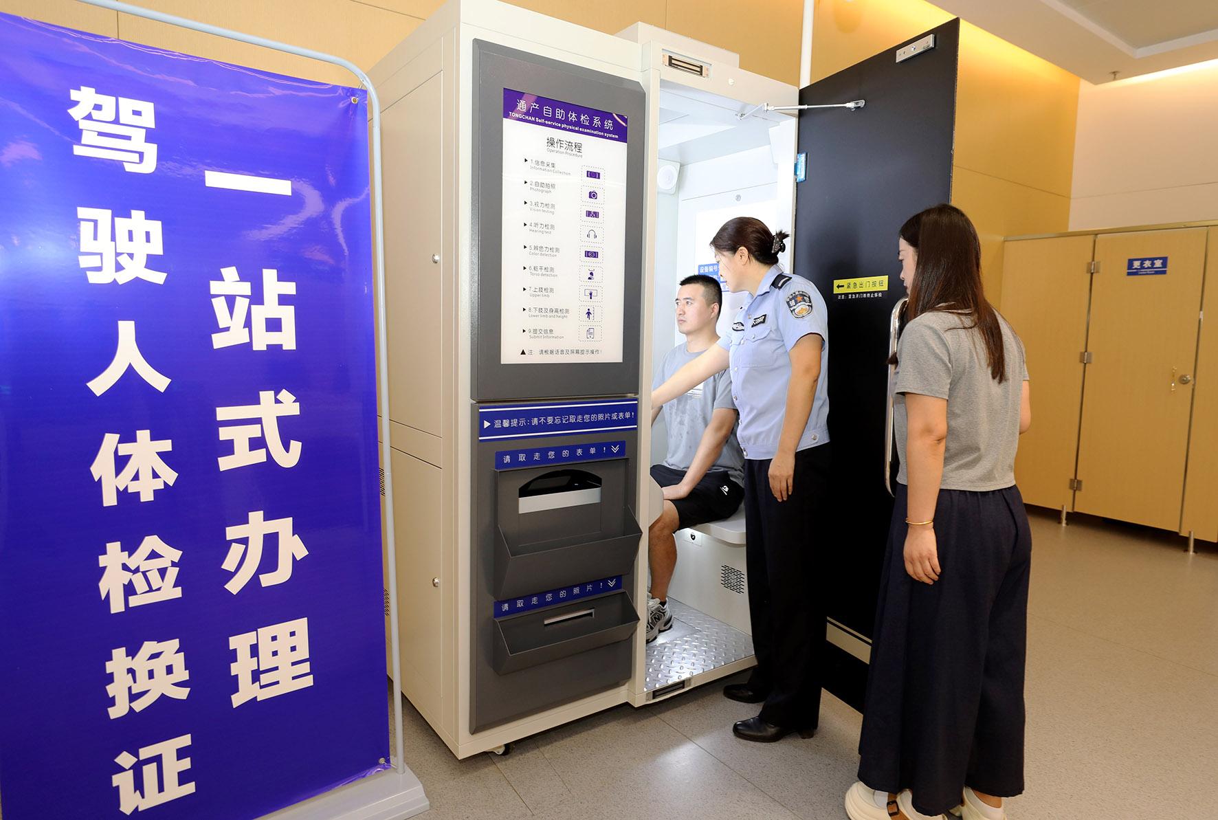 8月20日,安徽省淮北市政務(wù)服務(wù)大廳公安綜合窗口,工作人員指導(dǎo)換領(lǐng)駕駛證的群眾使用智能體檢設(shè)備。當日,淮北市政務(wù)服務(wù)大廳公安綜合窗口駕駛?cè)酥悄茏灾w檢機投入使用,設(shè)備配備AI輔助診斷系統(tǒng)和后臺醫(yī)生審核。