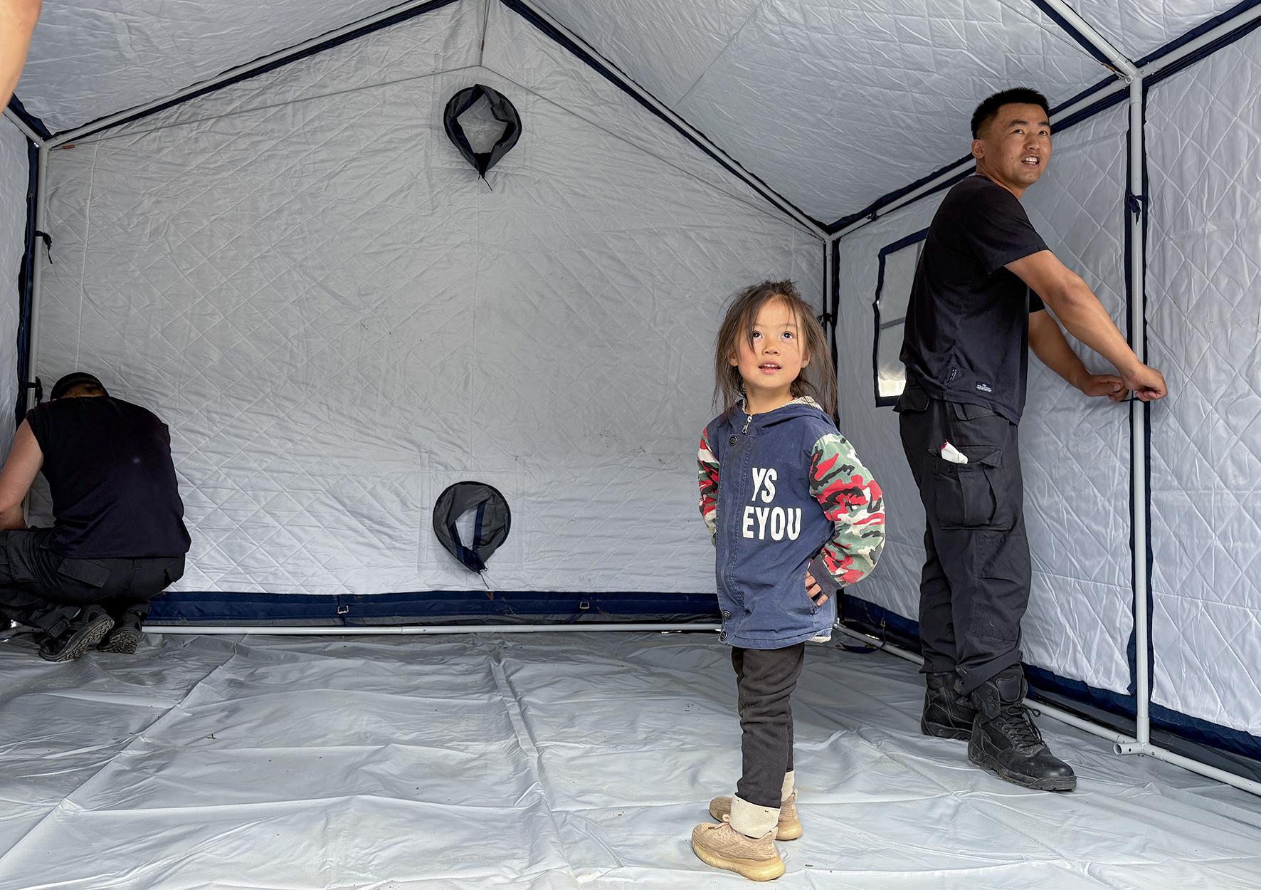 8月14日,蘇明凱和張云峰在帳篷里和瑤瑤拍合影。金萬貴 攝